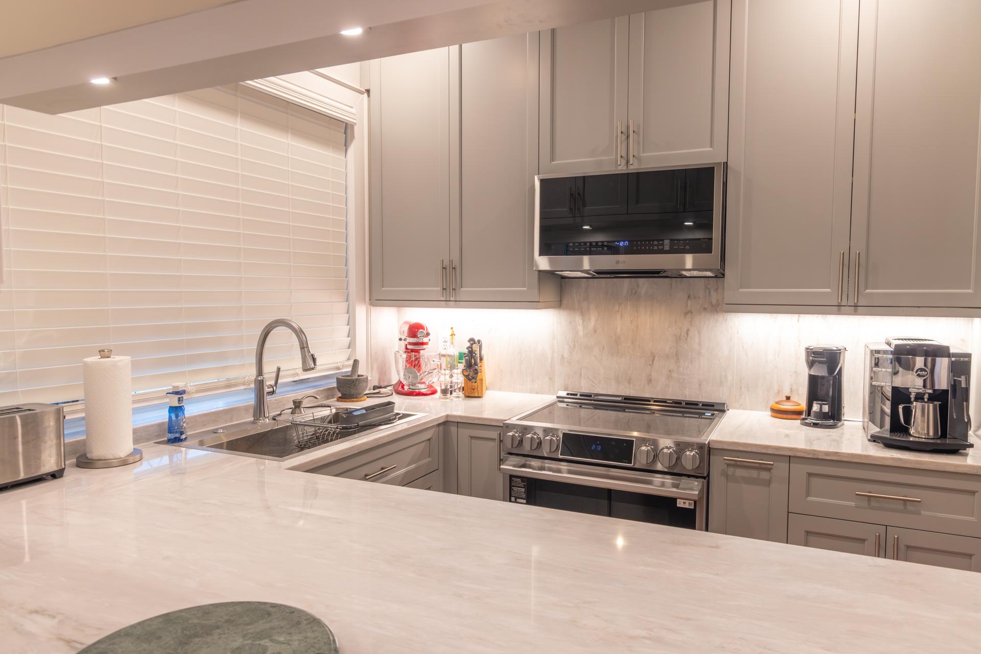 The Sleek Contemporary Kitchen: For a more modern aesthetic, this kitchen features sophisticated light grey shaker cabinets and a full suite of stainless steel appliances. The design is anchored by a stunning marble-look quartz countertop that extends up the wall as a full-height slab backsplash, creating a seamless and luxurious feel. Under-cabinet lighting highlights the clean lines and polished finishes.