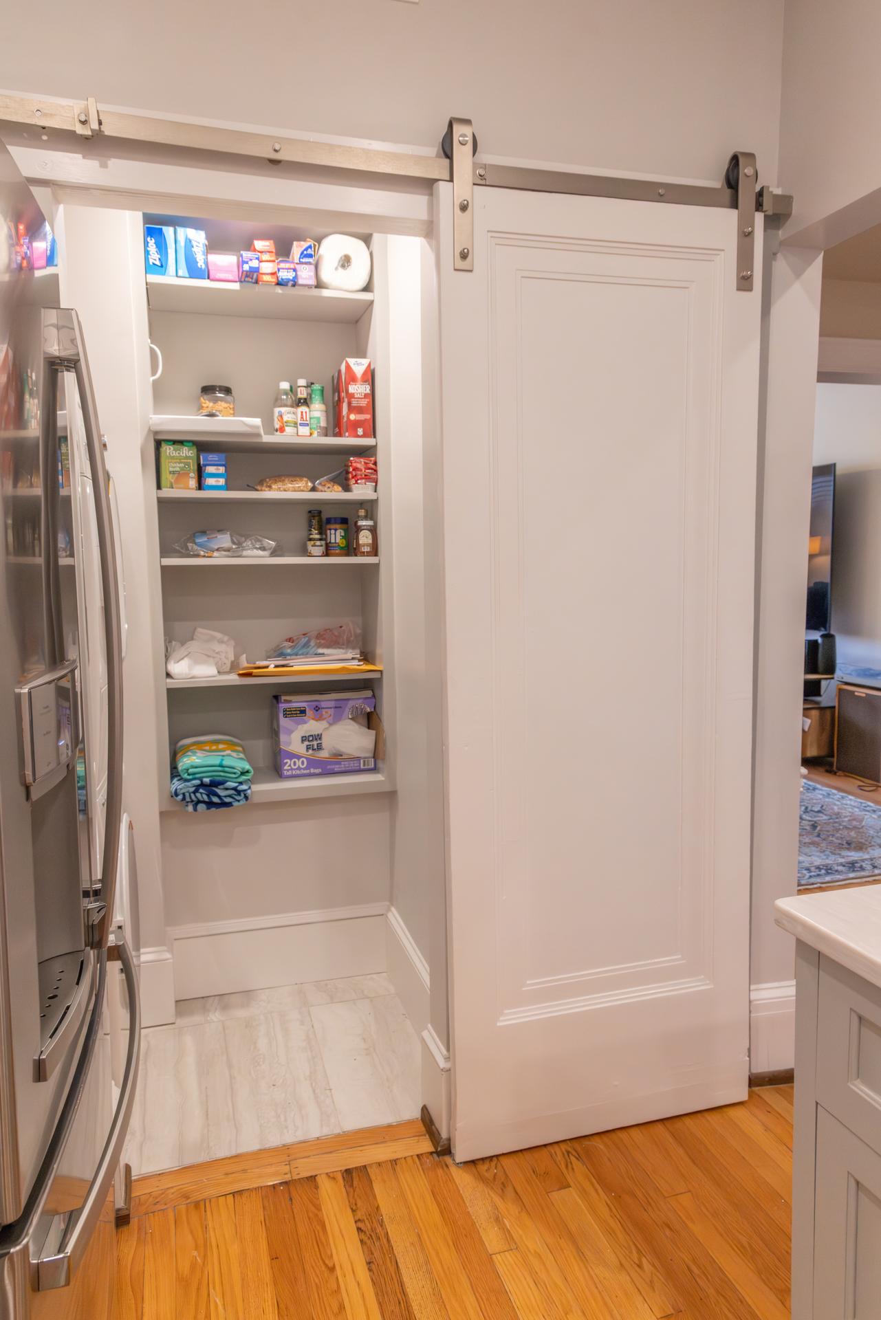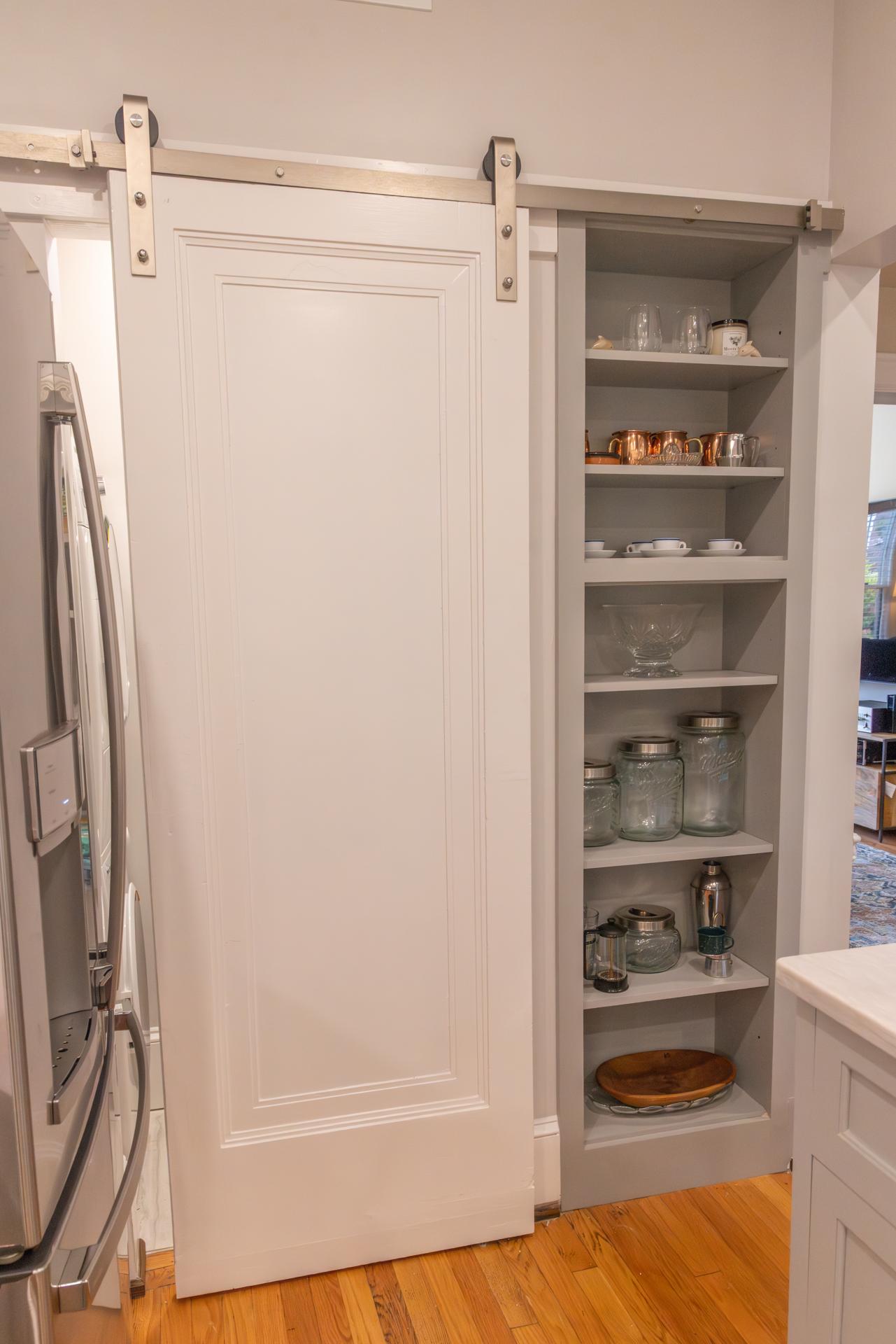 To maximize organization and maintain a clean aesthetic, we designed a custom built-in pantry. This smart storage solution is elegantly concealed behind a modern white sliding barn door on stainless steel hardware. Inside, deep, adjustable shelving provides abundant storage for groceries, dishware, and small appliances.