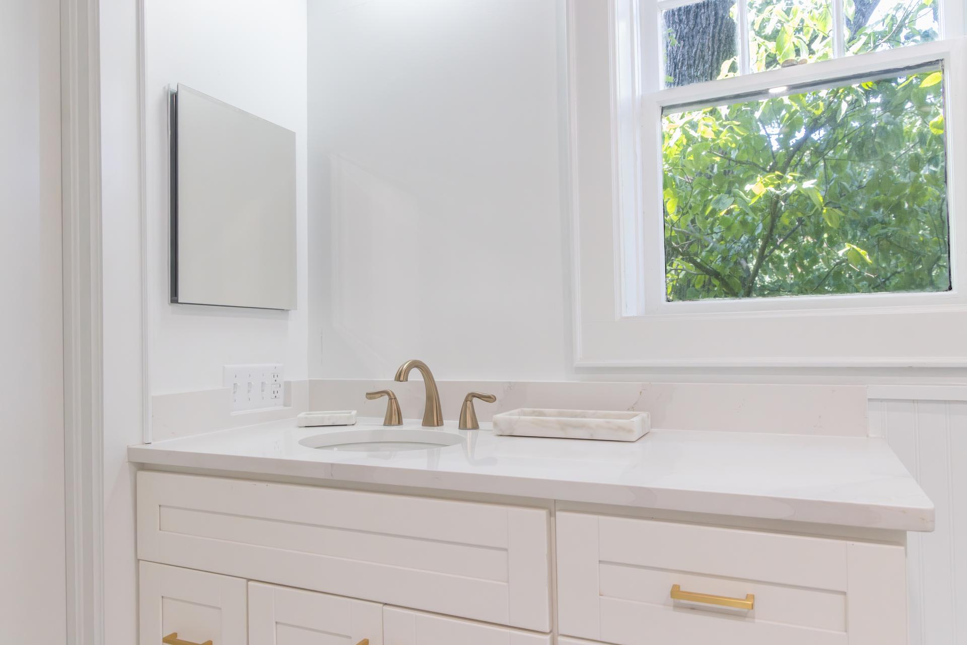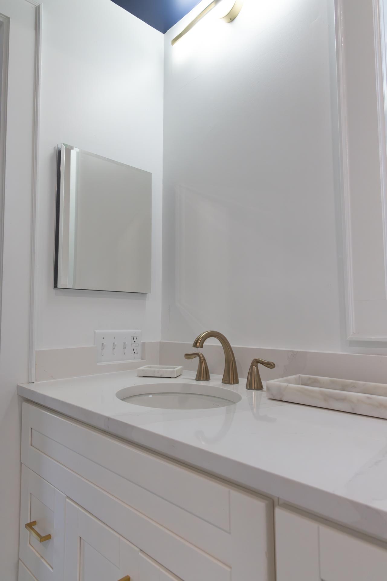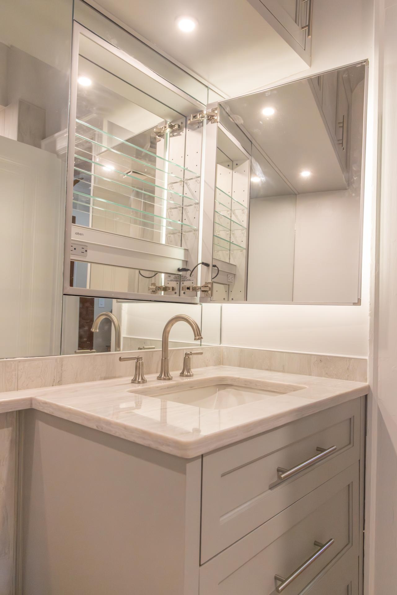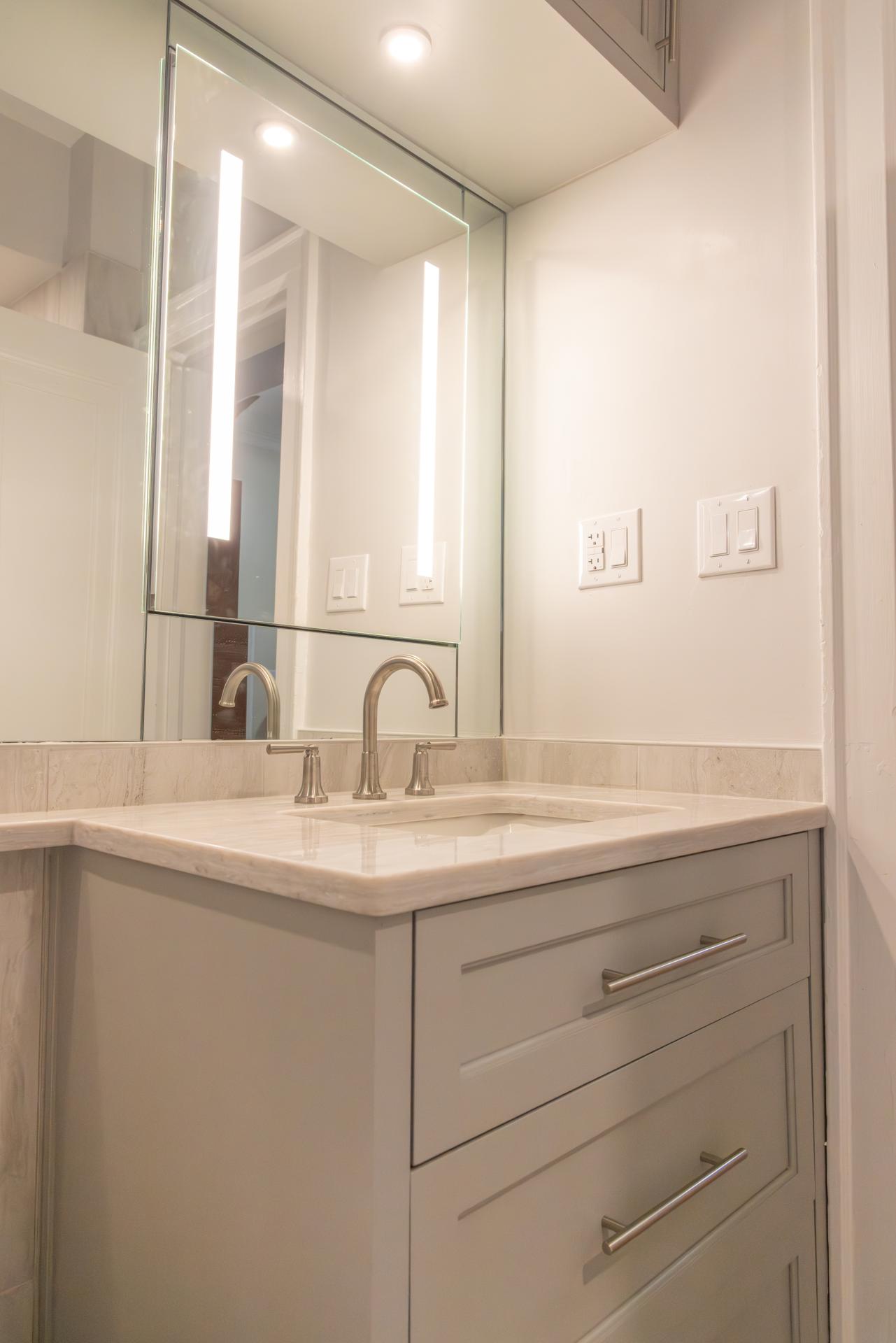 The original bathroom was completely updated to create a functional, spa-like sanctuary. We installed a new light grey vanity with a durable marble-look quartz top. The clear highlight is the high-tech mirrored medicine cabinet, which features integrated vertical LED lighting and convenient internal power outlets.
