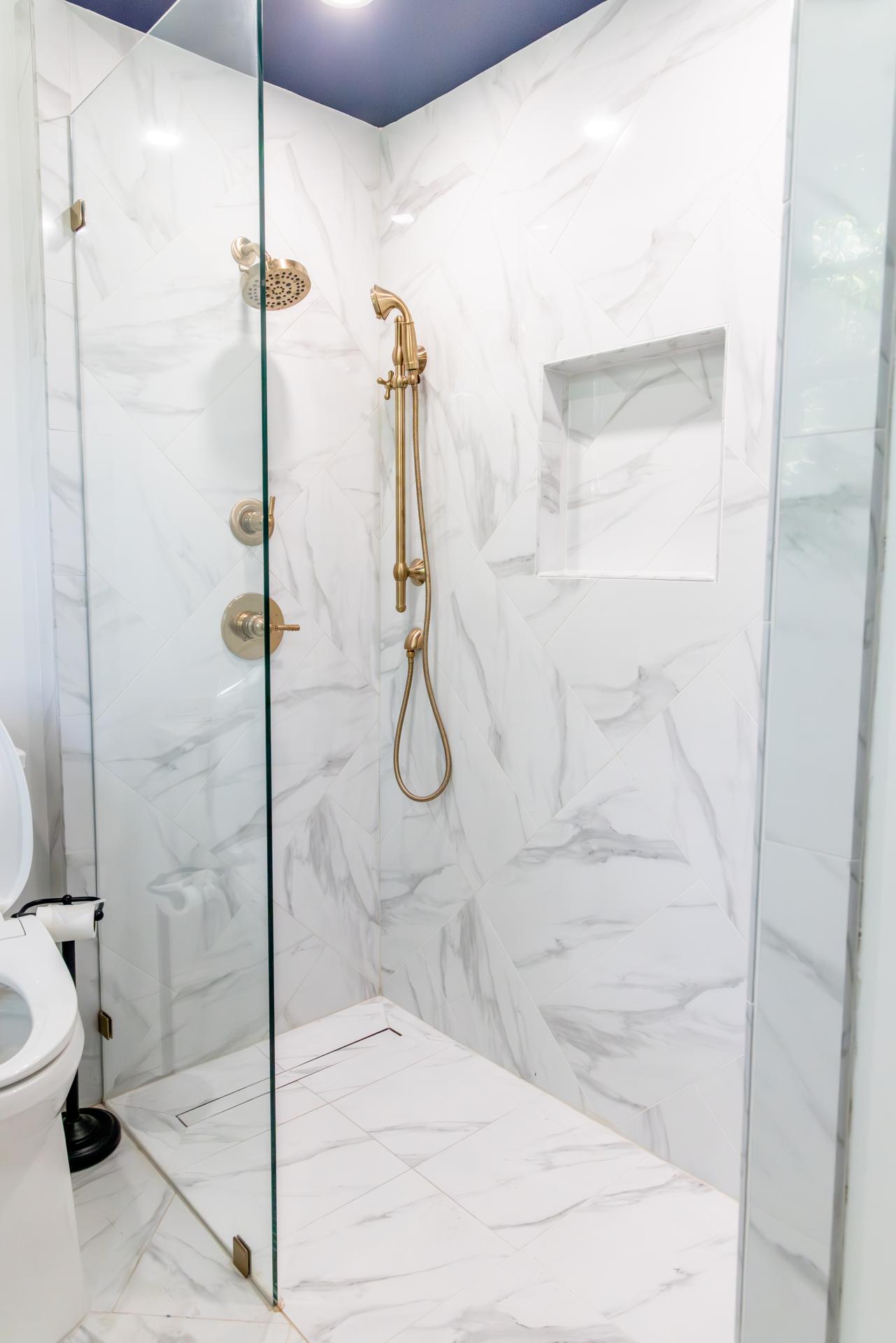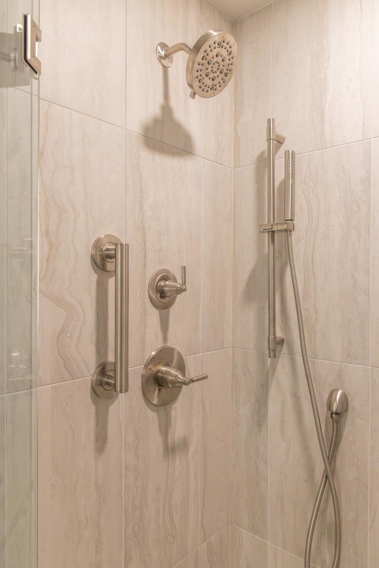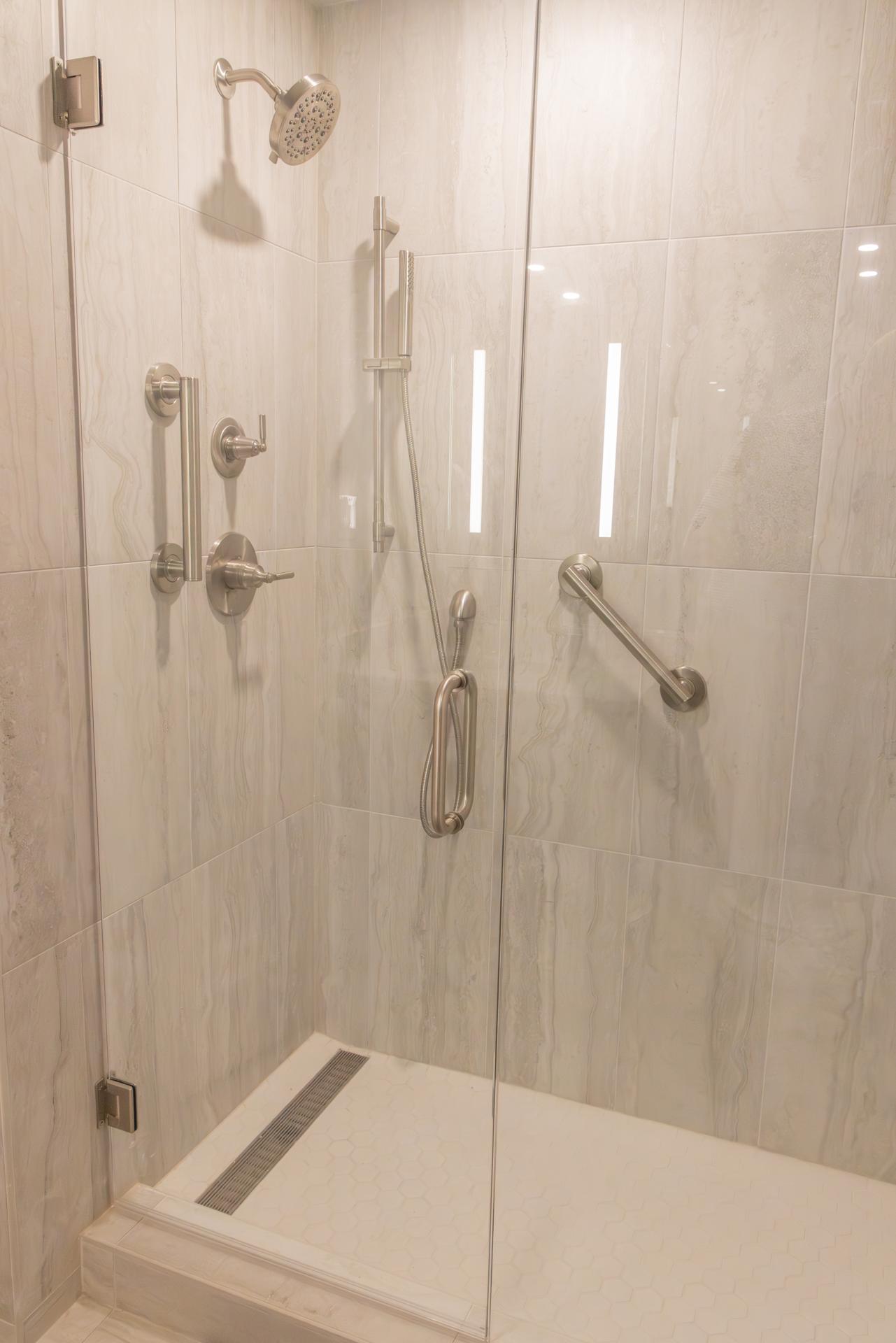 The new walk-in shower is enclosed in seamless glass and finished with floor-to-ceiling, large-format marble-look tile. This modern wet room is fully equipped with brushed nickel fixtures, including a rain showerhead, a separate handheld wand, and strategically placed accessibility grab bars for safety and comfort.