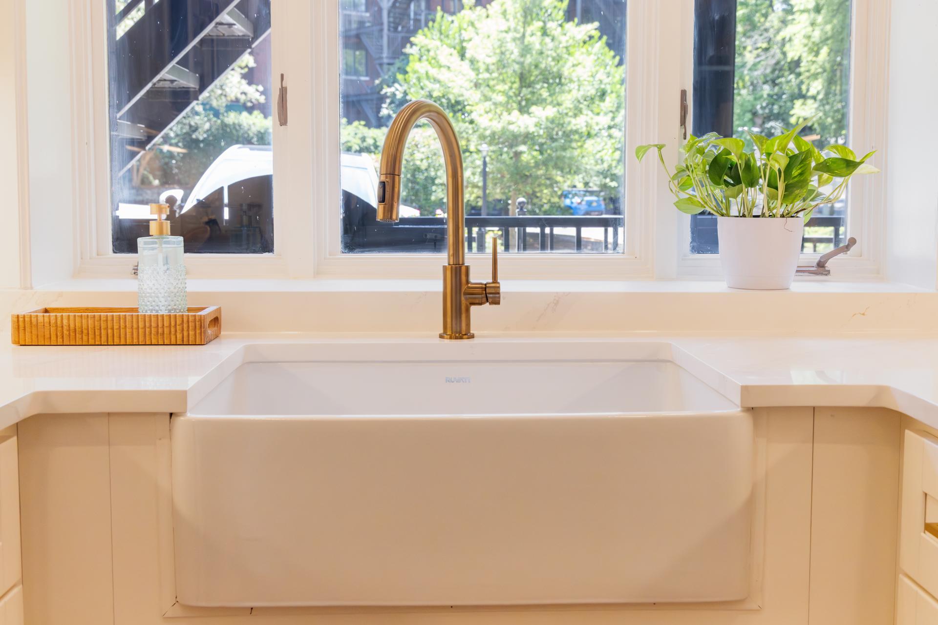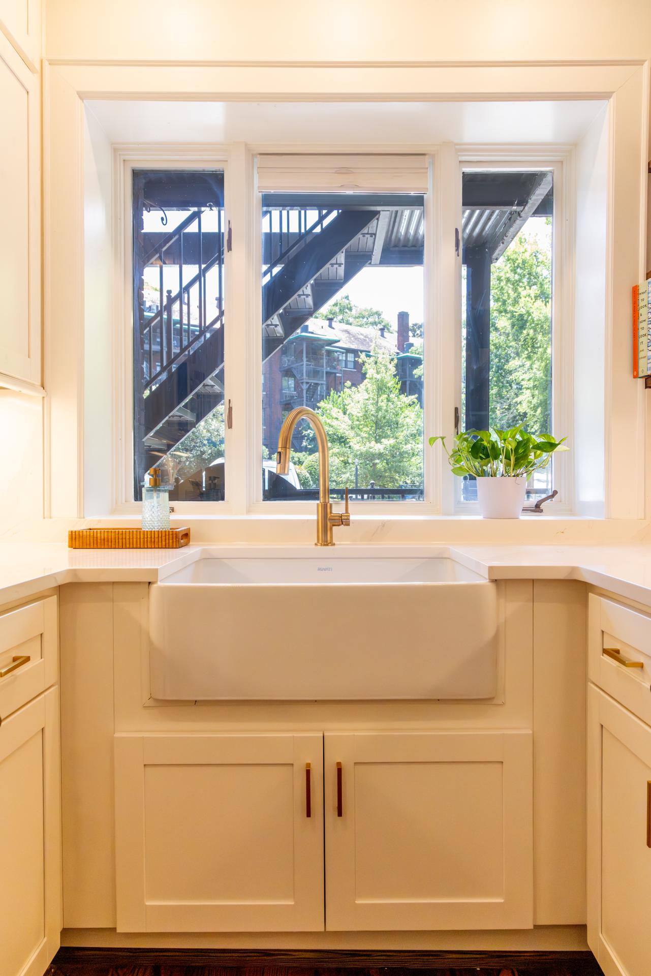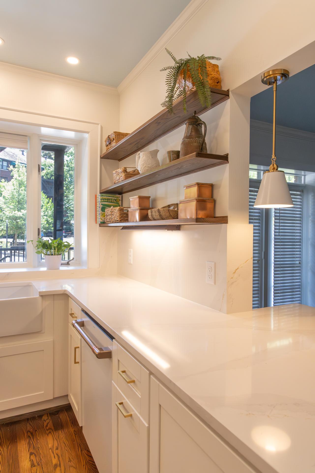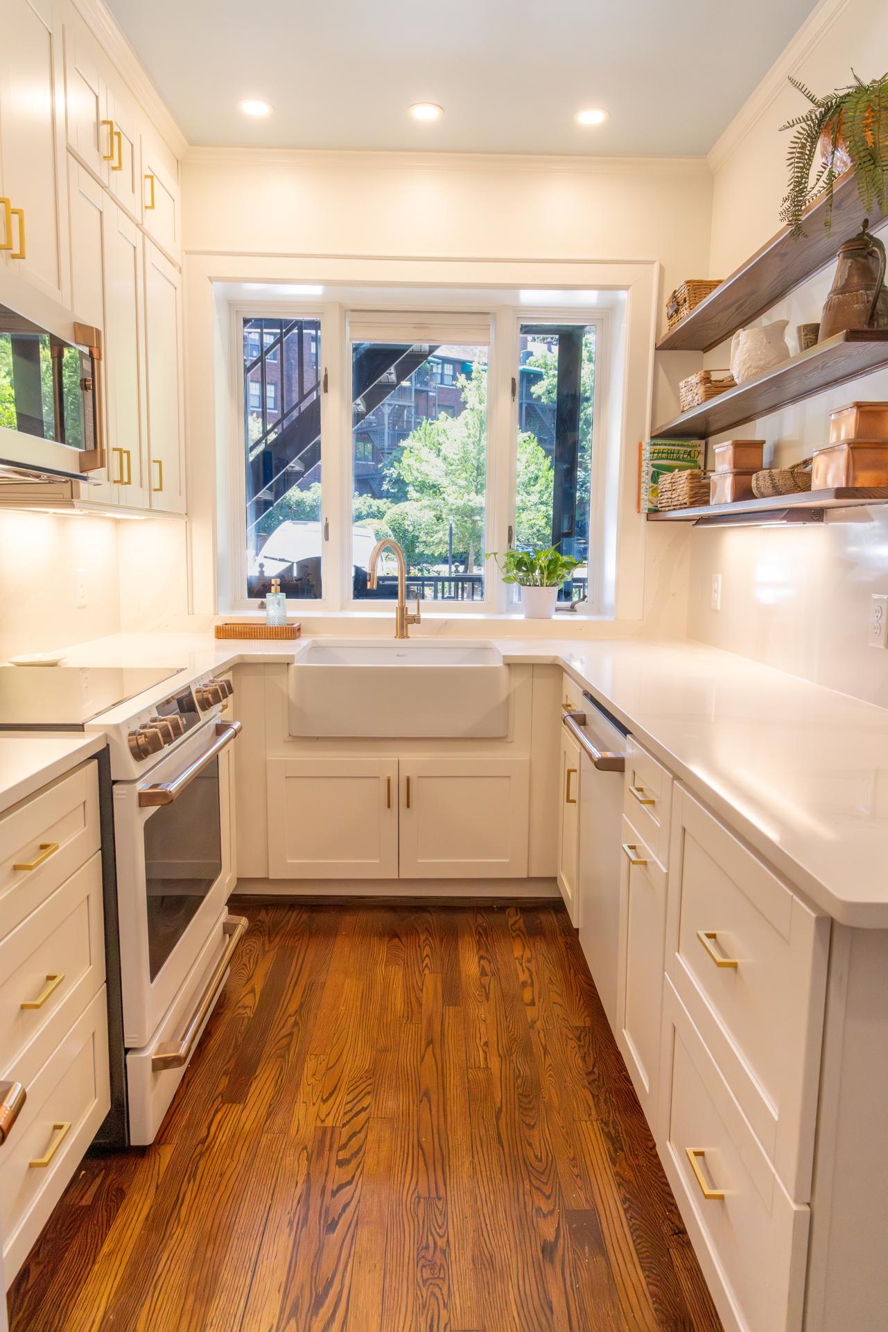 The Bright Transitional Kitchen: This U-shaped kitchen is a study in bright, airy design. We installed crisp, white shaker cabinetry paired with elegant brushed-gold hardware. The centerpiece is a classic white apron-front (farmhouse) sink, perfectly positioned under a large window. Clean white quartz countertops and open shelving complete this timeless, welcoming space.