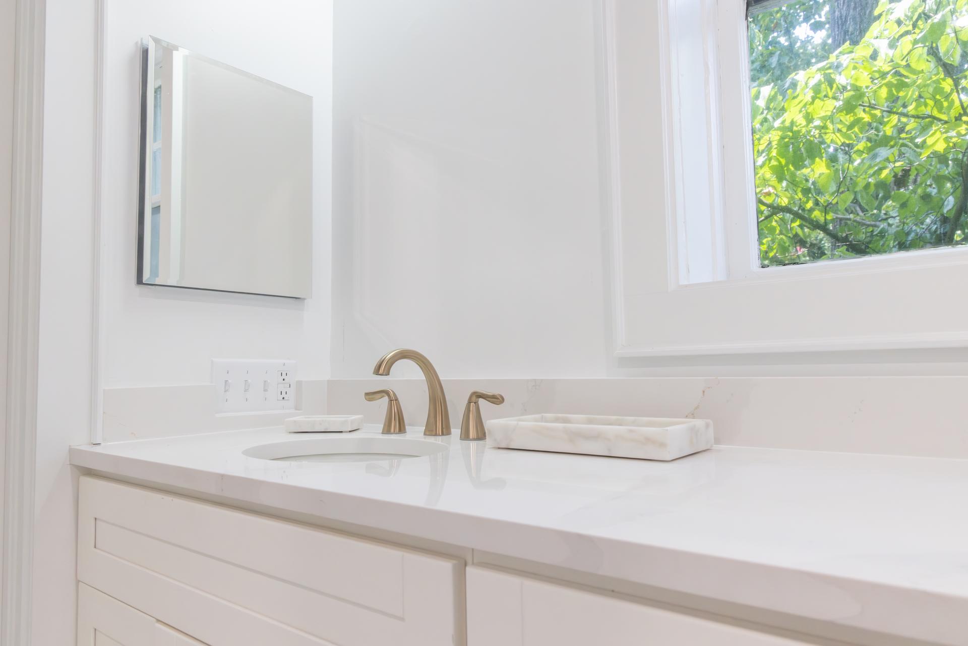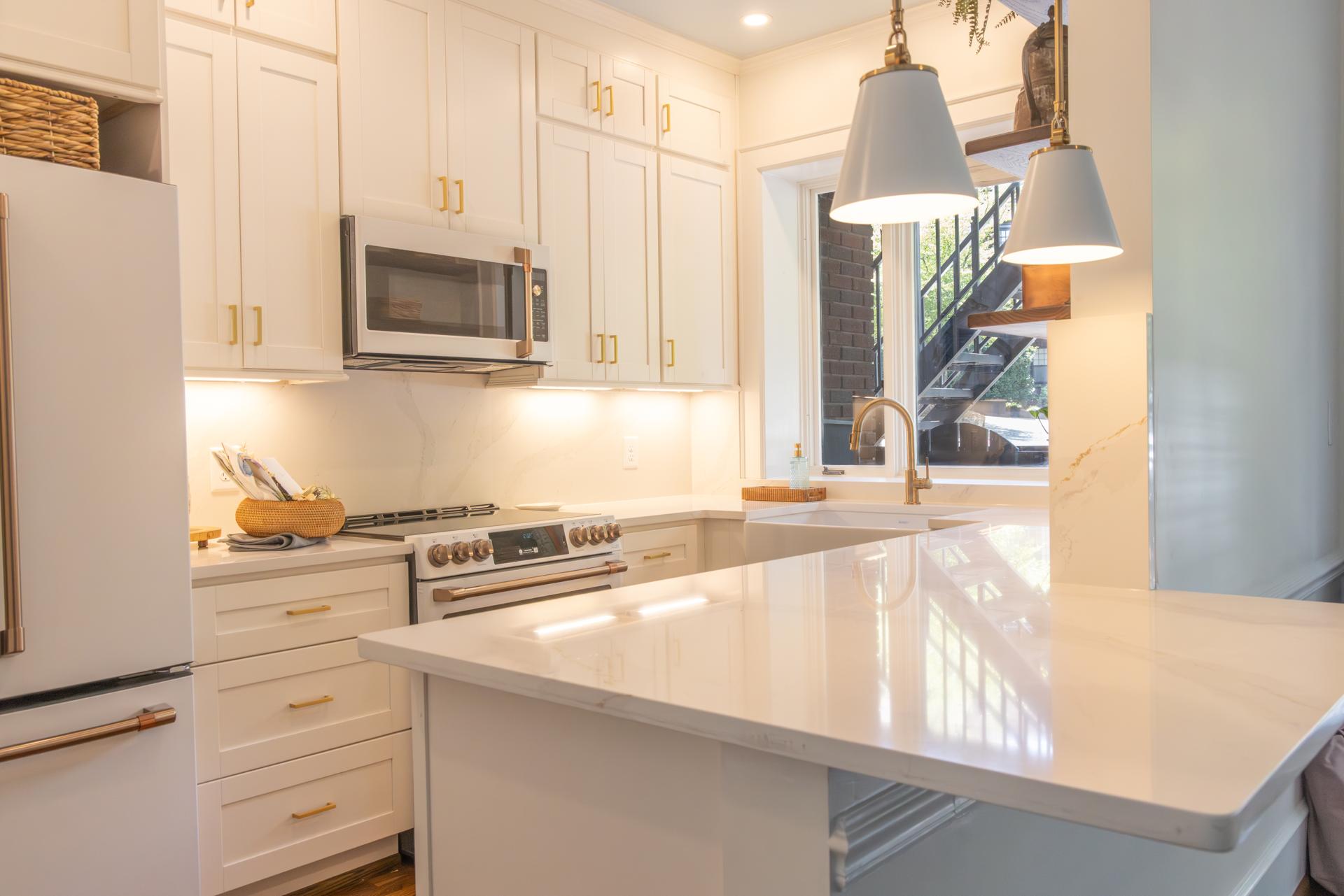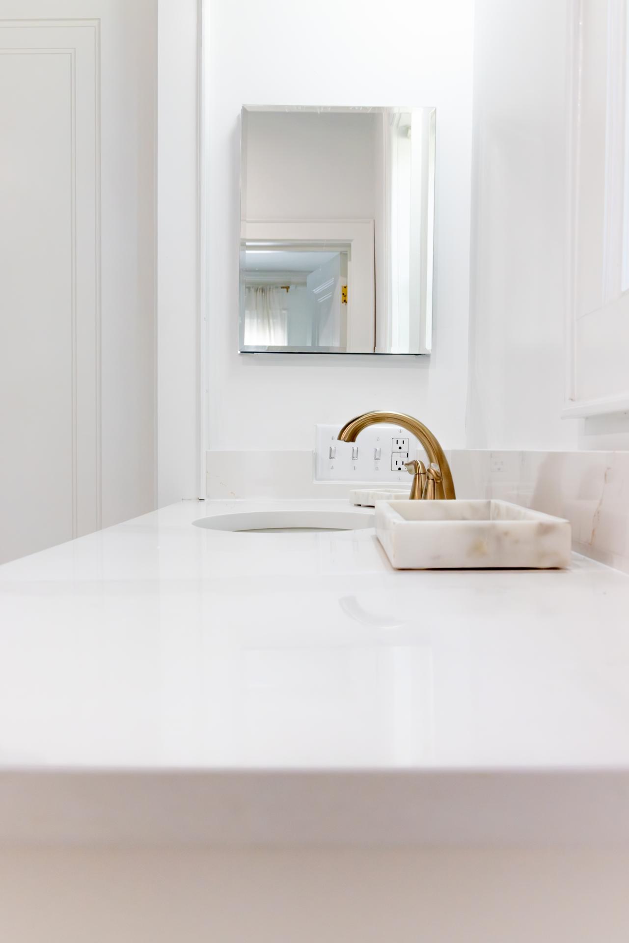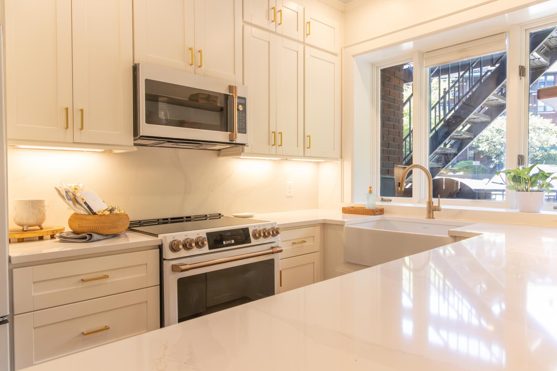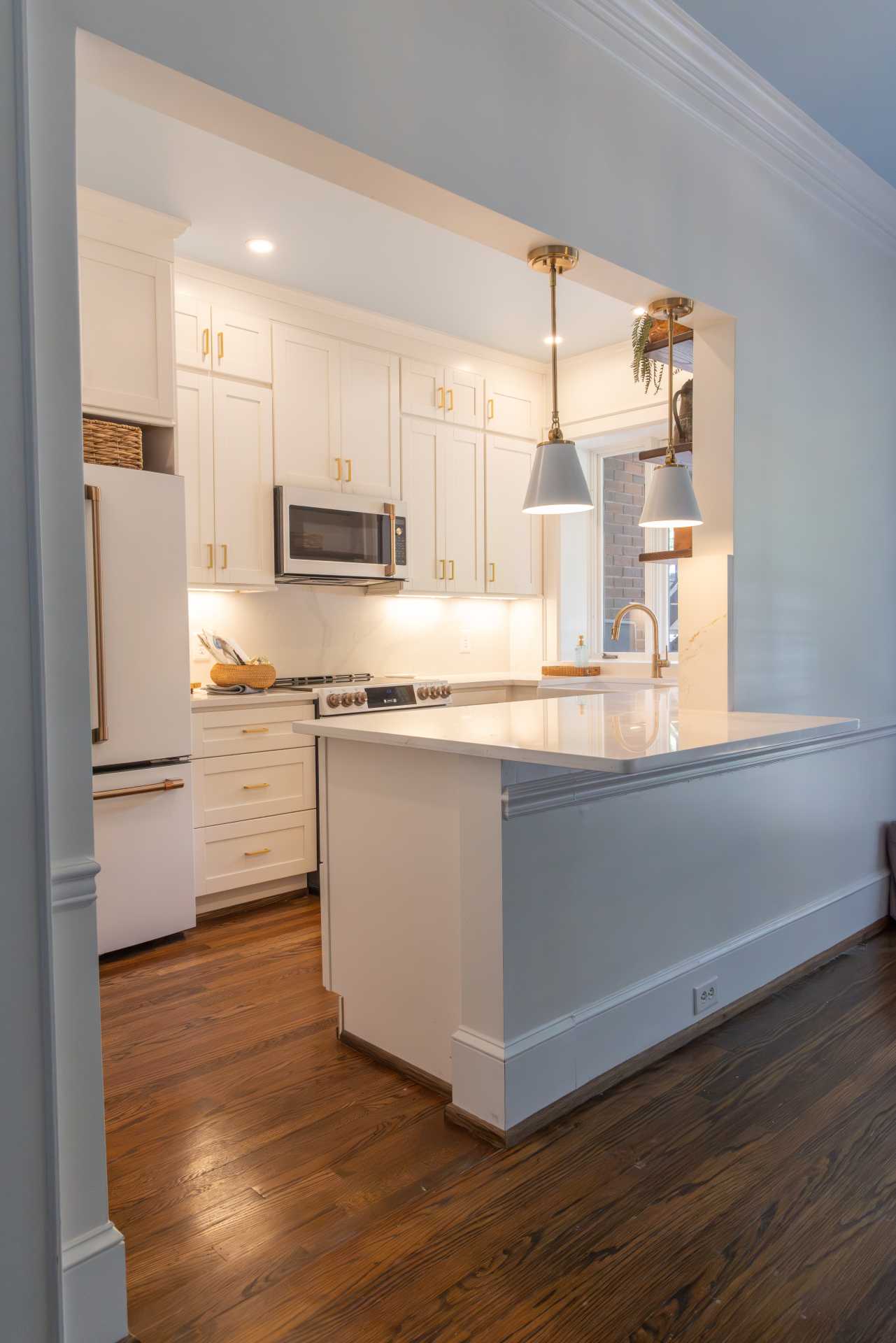 The Bright Transitional Kitchen: This U-shaped kitchen is a study in bright, airy design. We installed crisp, white shaker cabinetry paired with elegant brushed-gold hardware. The centerpiece is a classic white apron-front (farmhouse) sink, perfectly positioned under a large window. Clean white quartz countertops and open shelving complete this timeless, welcoming space.