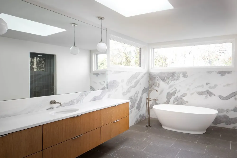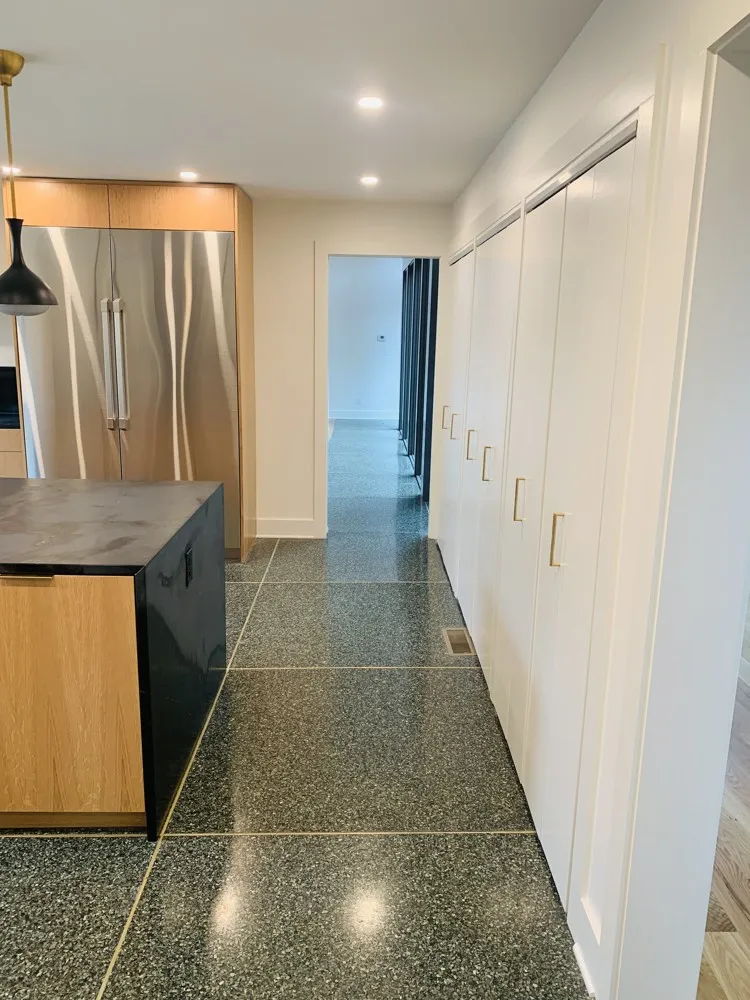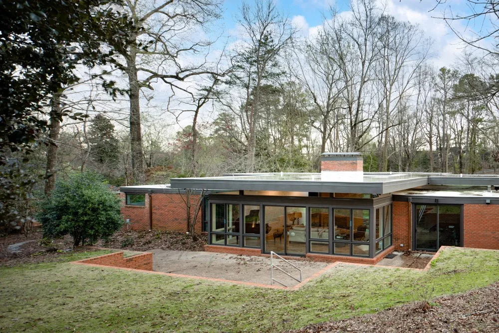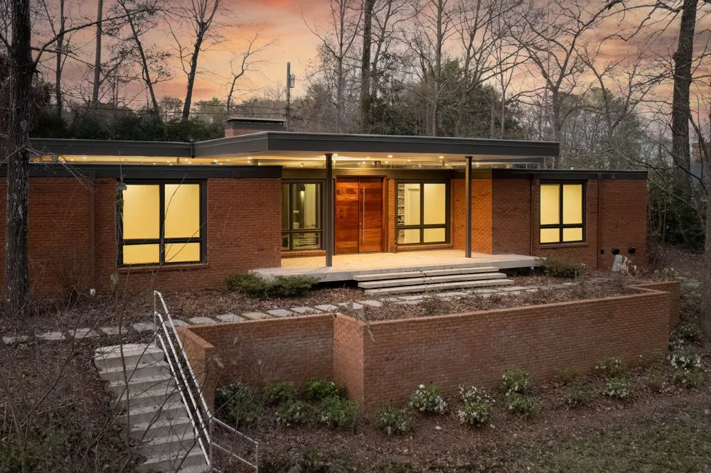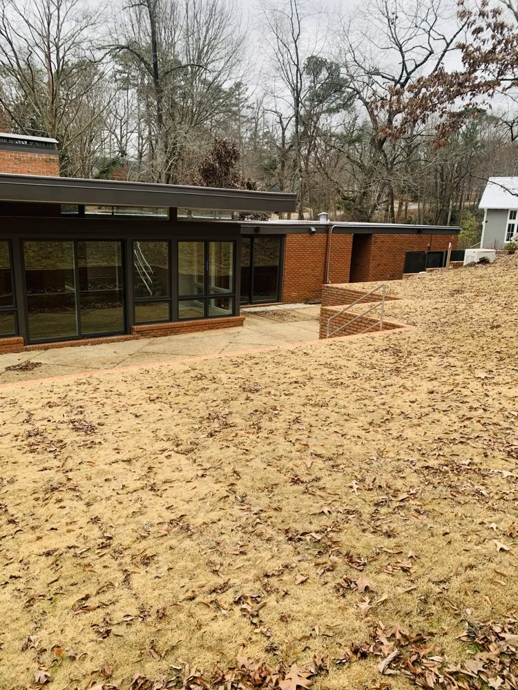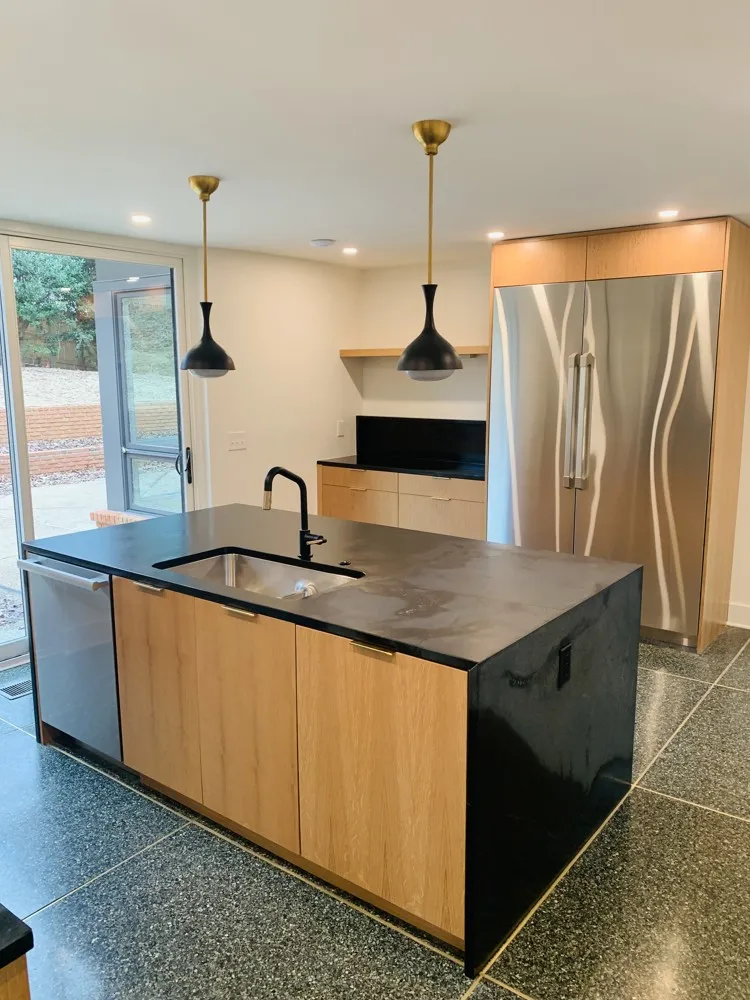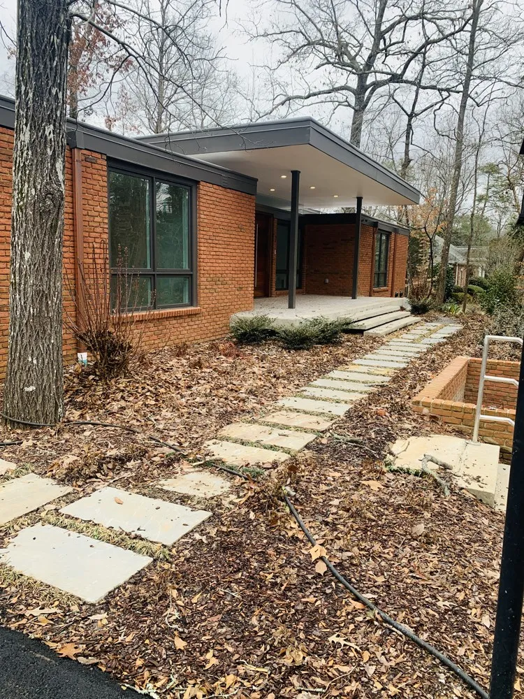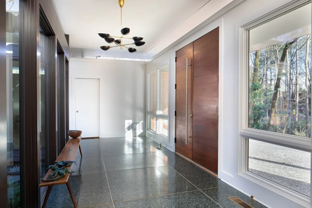 This unique, mid-century modern home, was completely remodeled by SouthFace. From adding on to the home to provide a large master bathroom and closet, to re-paving the driveway, this home was revitalized in every way. The subfloor in this home was replaced. Terrazzo and hardwood floors were installed throughout the home. The new master bathroom was completed with a steam shower which includes a rain head, a freestanding bathtub that is surrounded by a marble slab, a custom floating vanity with a matching marble countertop, and all new tile. Custom shelving was installed throughout the home including the master closet which was completed with a washer and drier hooked up, and custom cabinetry. All of the trim and doors in the home were replaced. The kitchen was completely renovated with new custom cabinetry, countertops, and appliances. A new shop was built by SouthFace. The asphalt driveway was repaved and the roof was replaced.