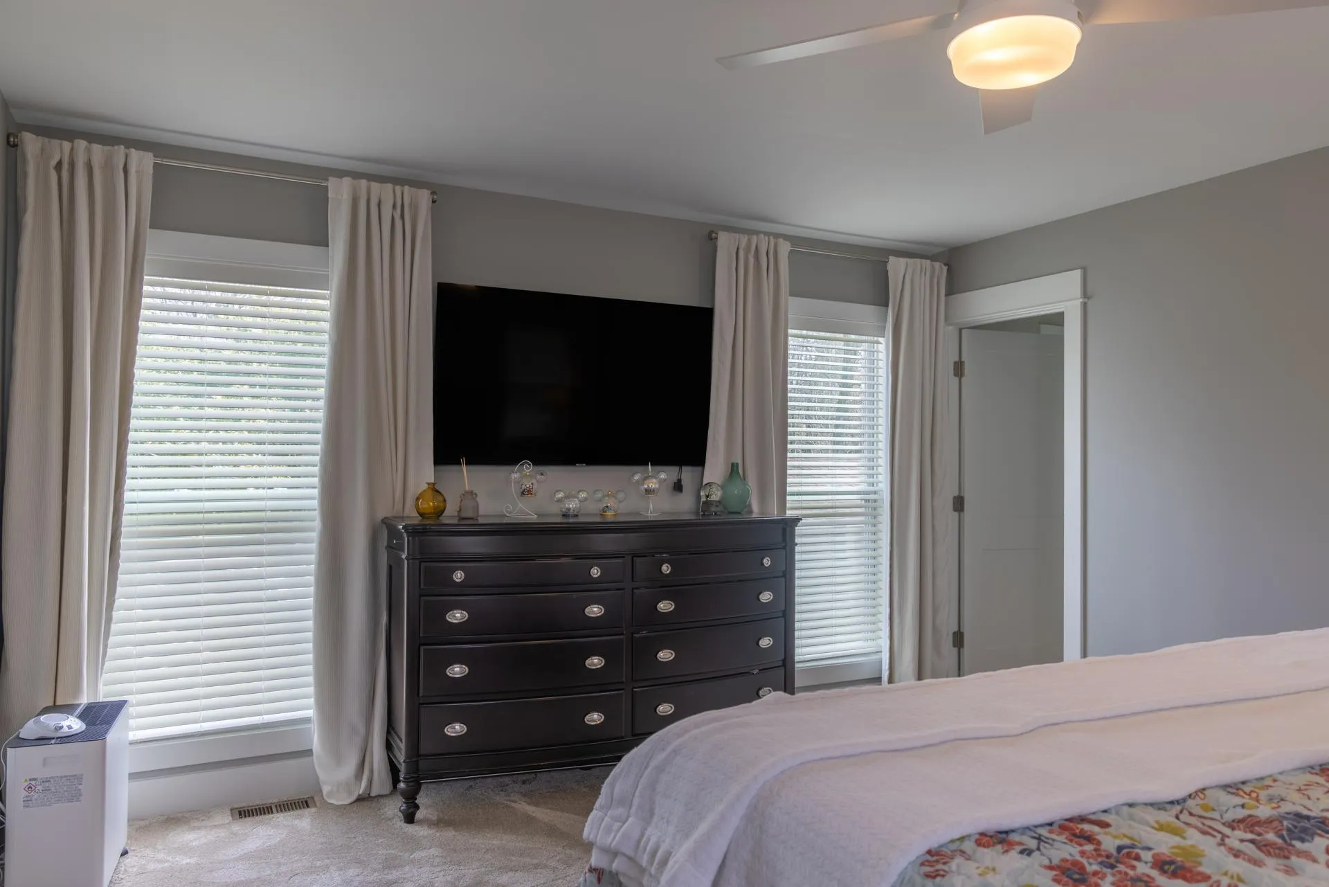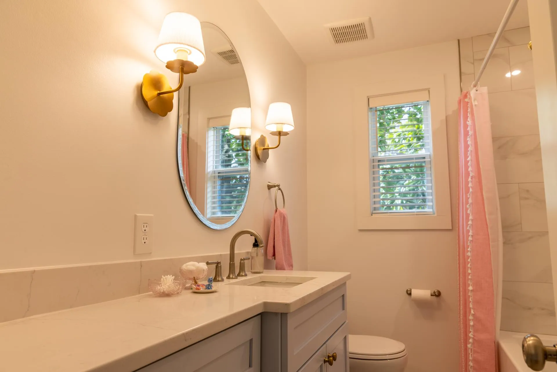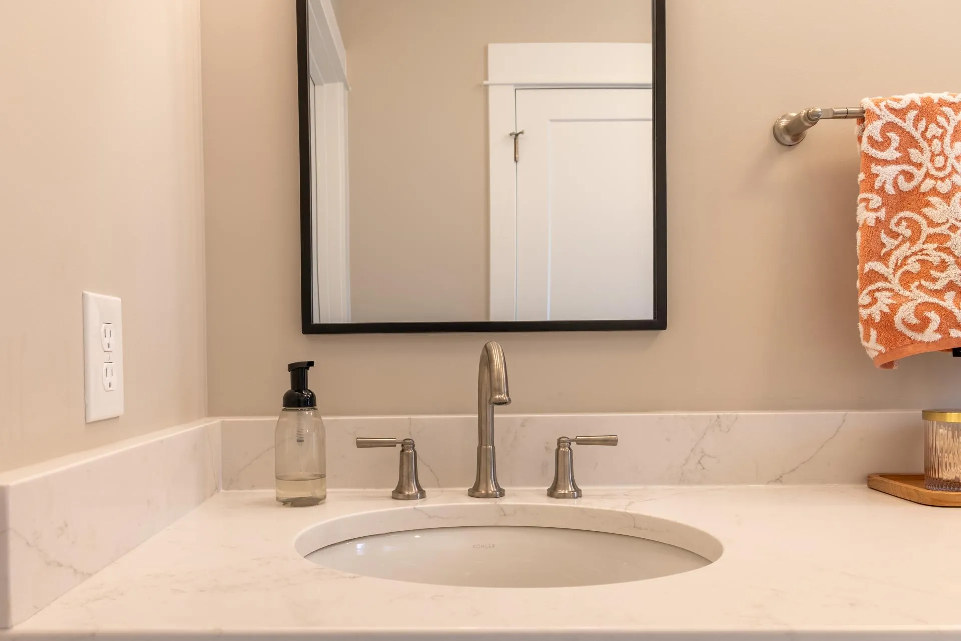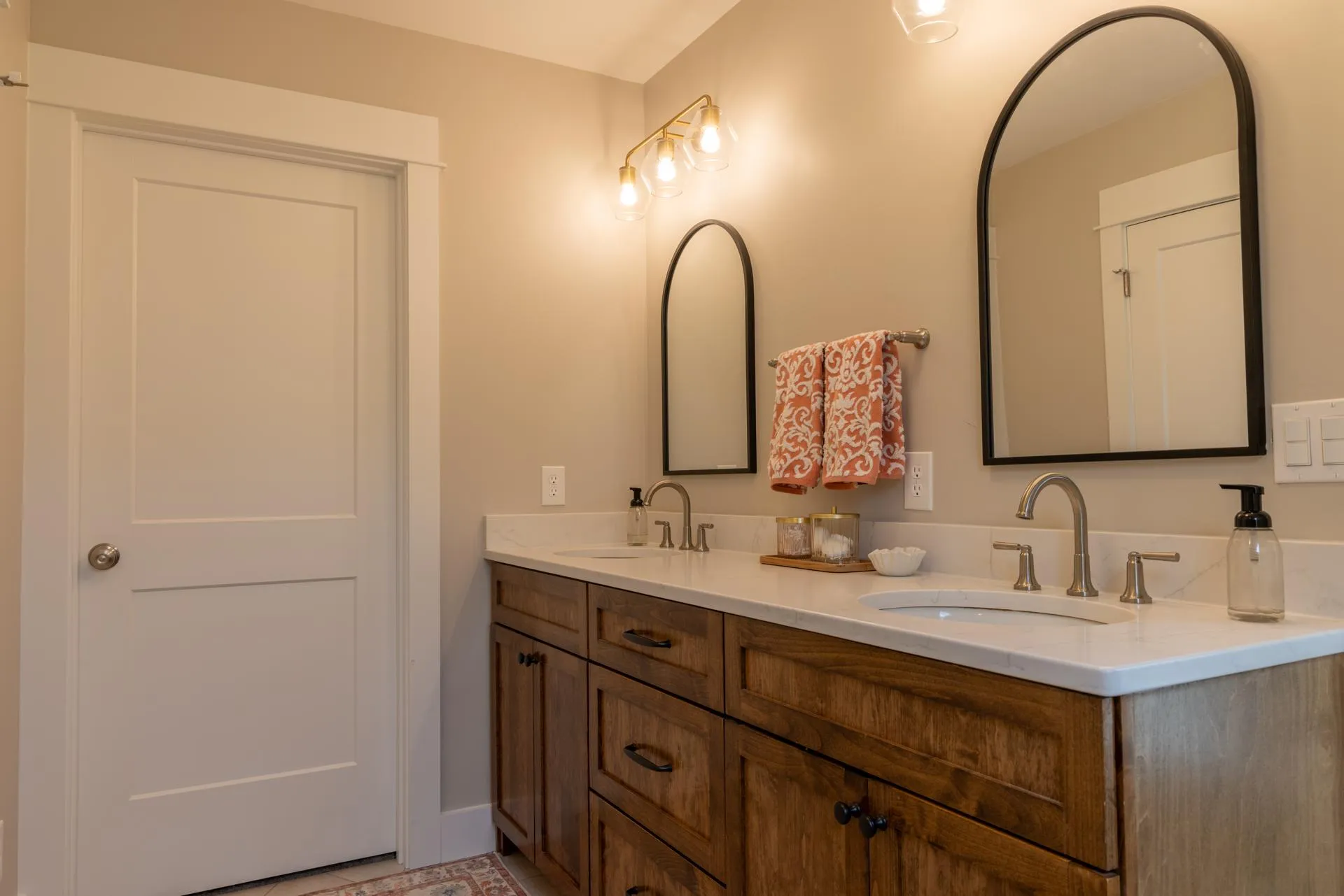 A Serene Master Suite & Spa-Like Bathroom The master suite was designed as a peaceful retreat. In the bathroom, we created a spa-like experience with a new dual-vanity featuring cabinetry that matches the kitchen for a cohesive look. The elegant quartz countertop, modern arched mirrors, and stylish lighting fixtures complete the high-end custom feel.