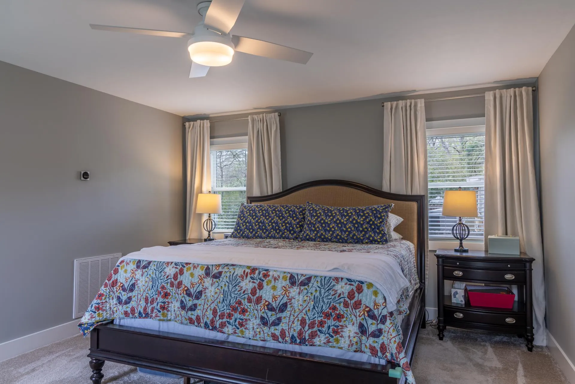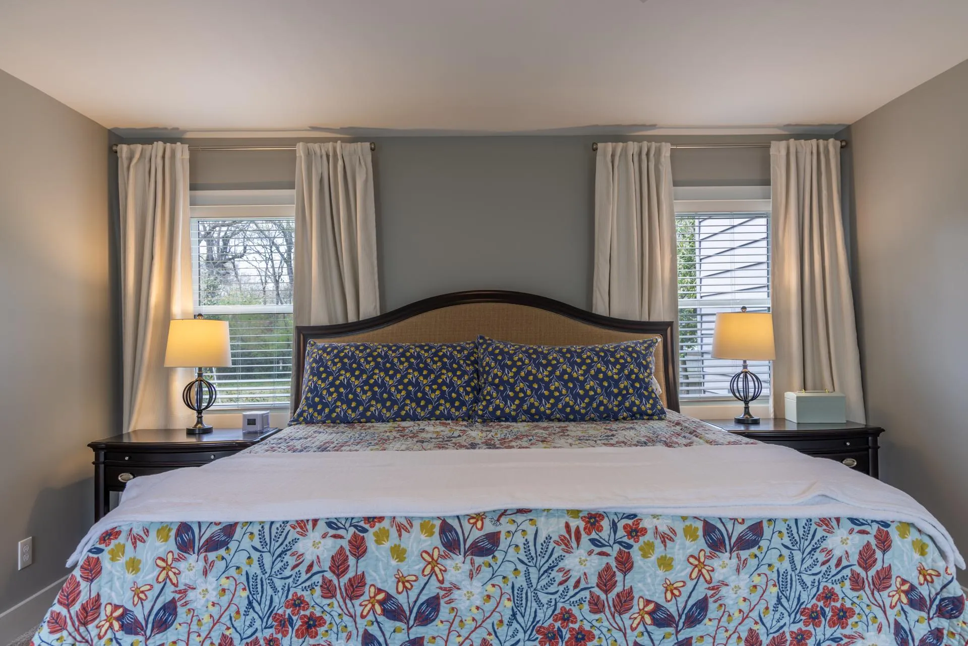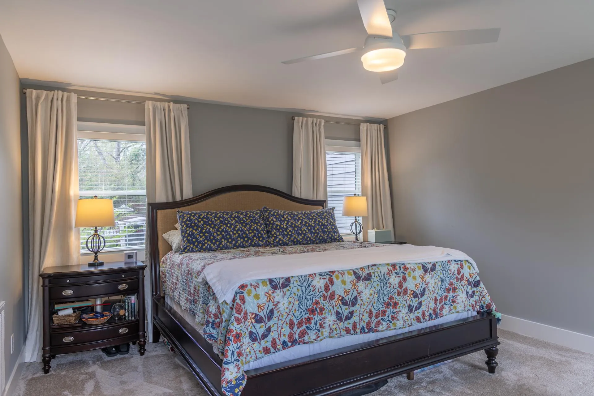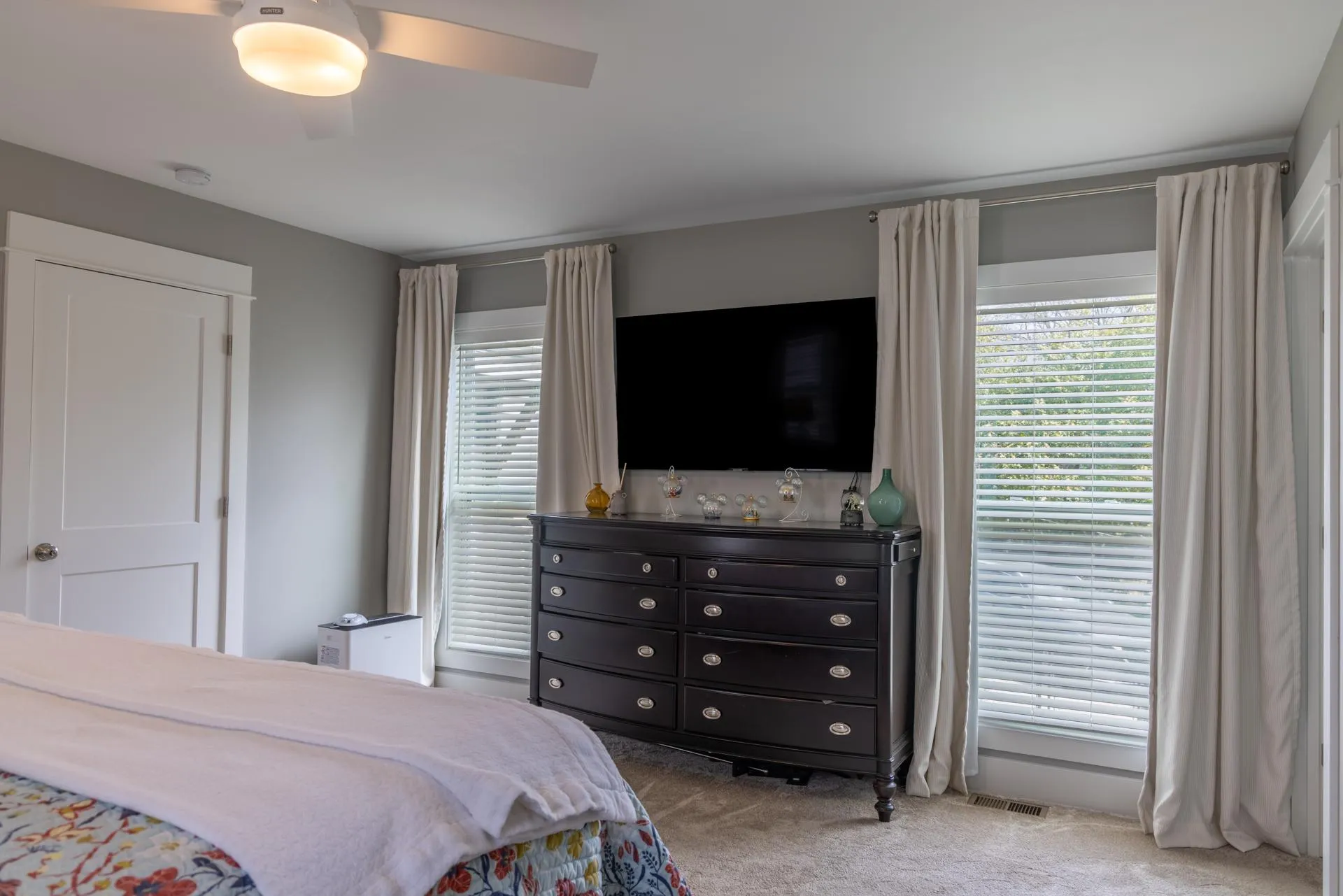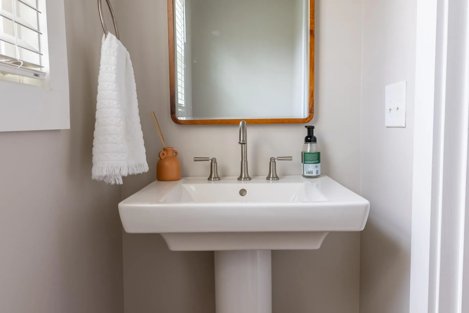 A Serene Master Suite & Spa-Like Bathroom The master suite was designed as a peaceful retreat. In the bathroom, we created a spa-like experience with a new dual-vanity featuring cabinetry that matches the kitchen for a cohesive look. The elegant quartz countertop, modern arched mirrors, and stylish lighting fixtures complete the high-end custom feel.