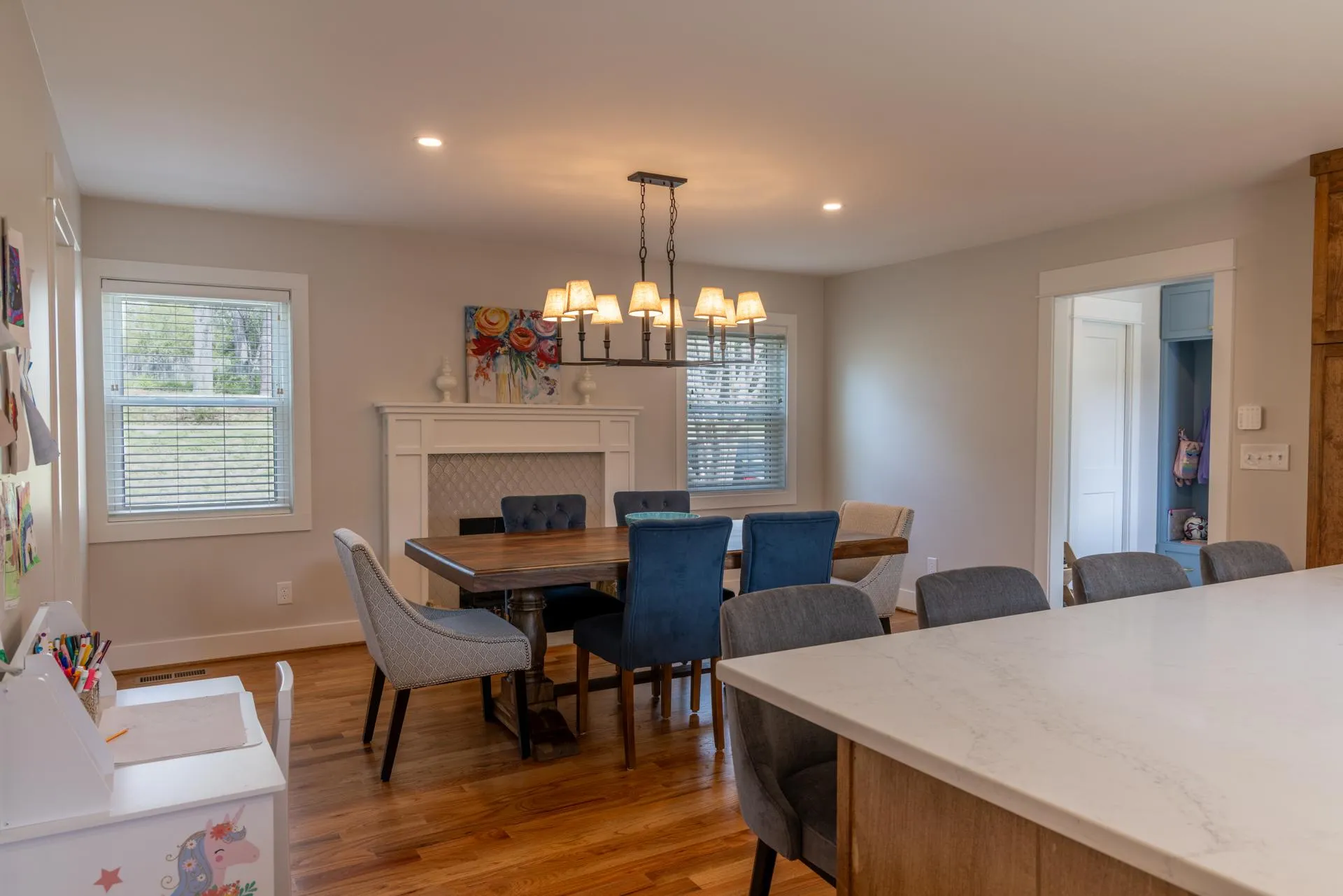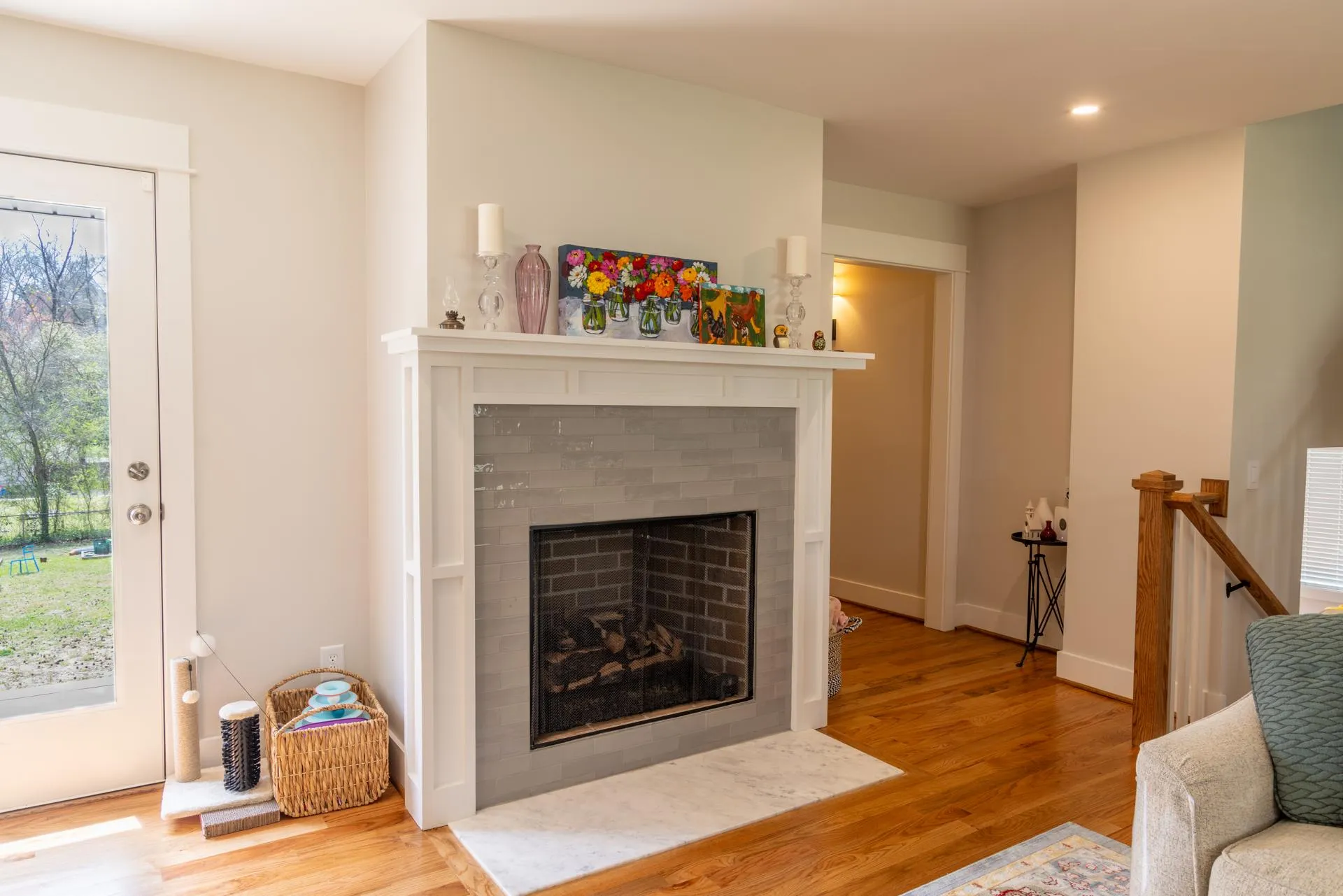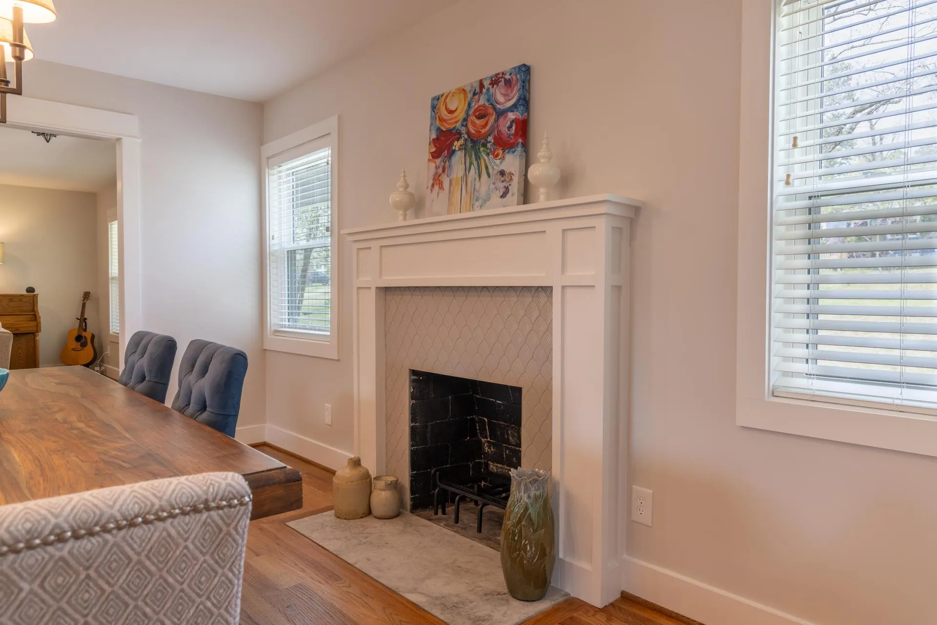 Open and Inviting Living Spaces We carried the warm hardwood floors throughout the main living areas to create a seamless, open-concept flow. In the dining area, the fireplace was updated with a stylish new tile surround, creating a beautiful focal point. The adjacent living room is designed for comfort and relaxation, seamlessly connecting the entryway, dining space, and kitchen into one harmonious area.