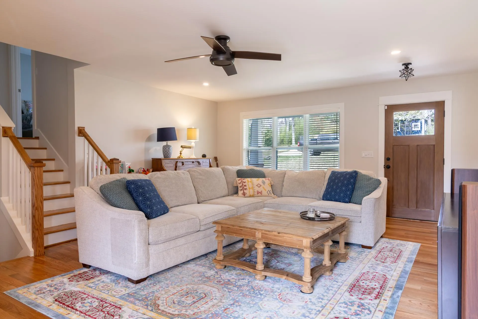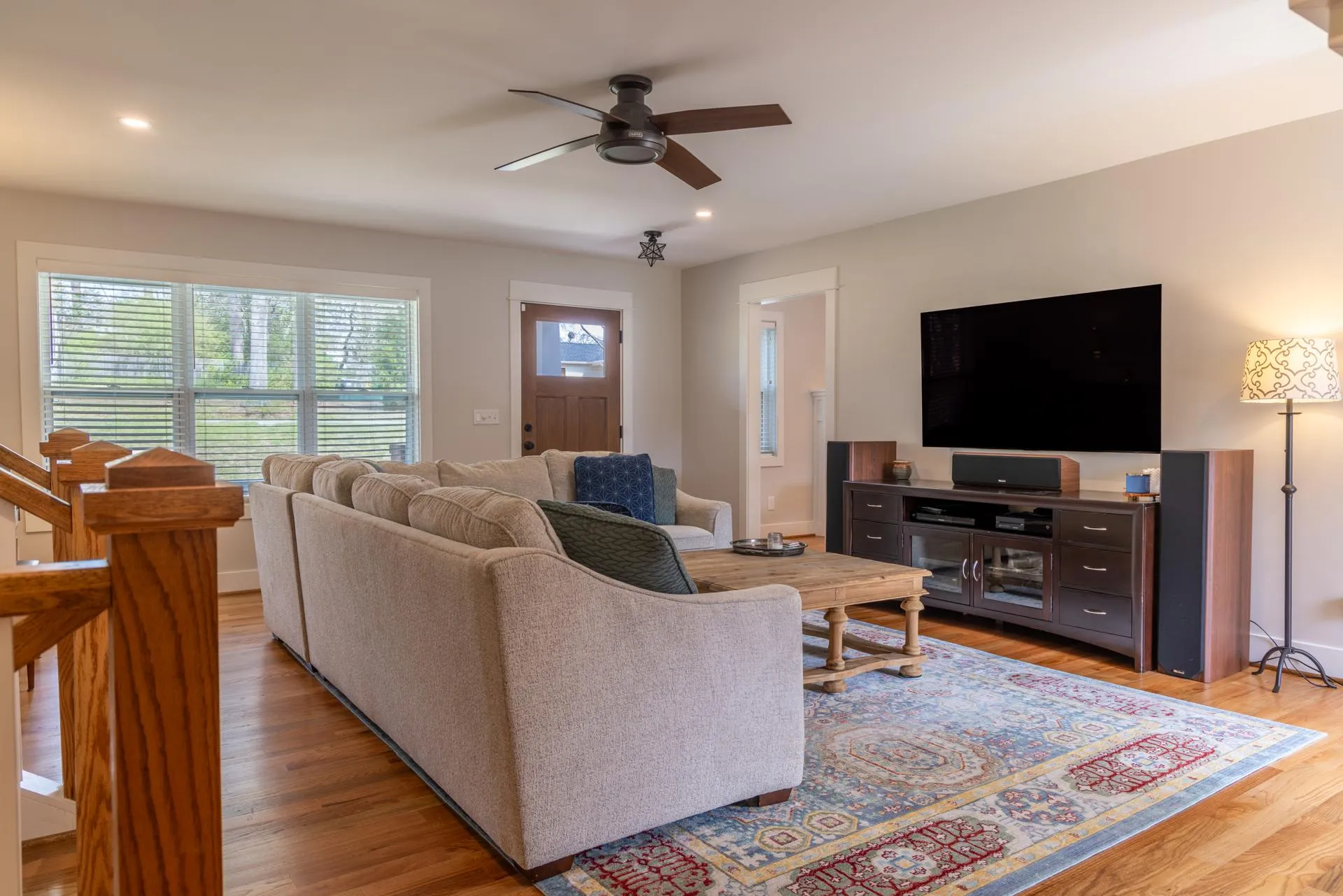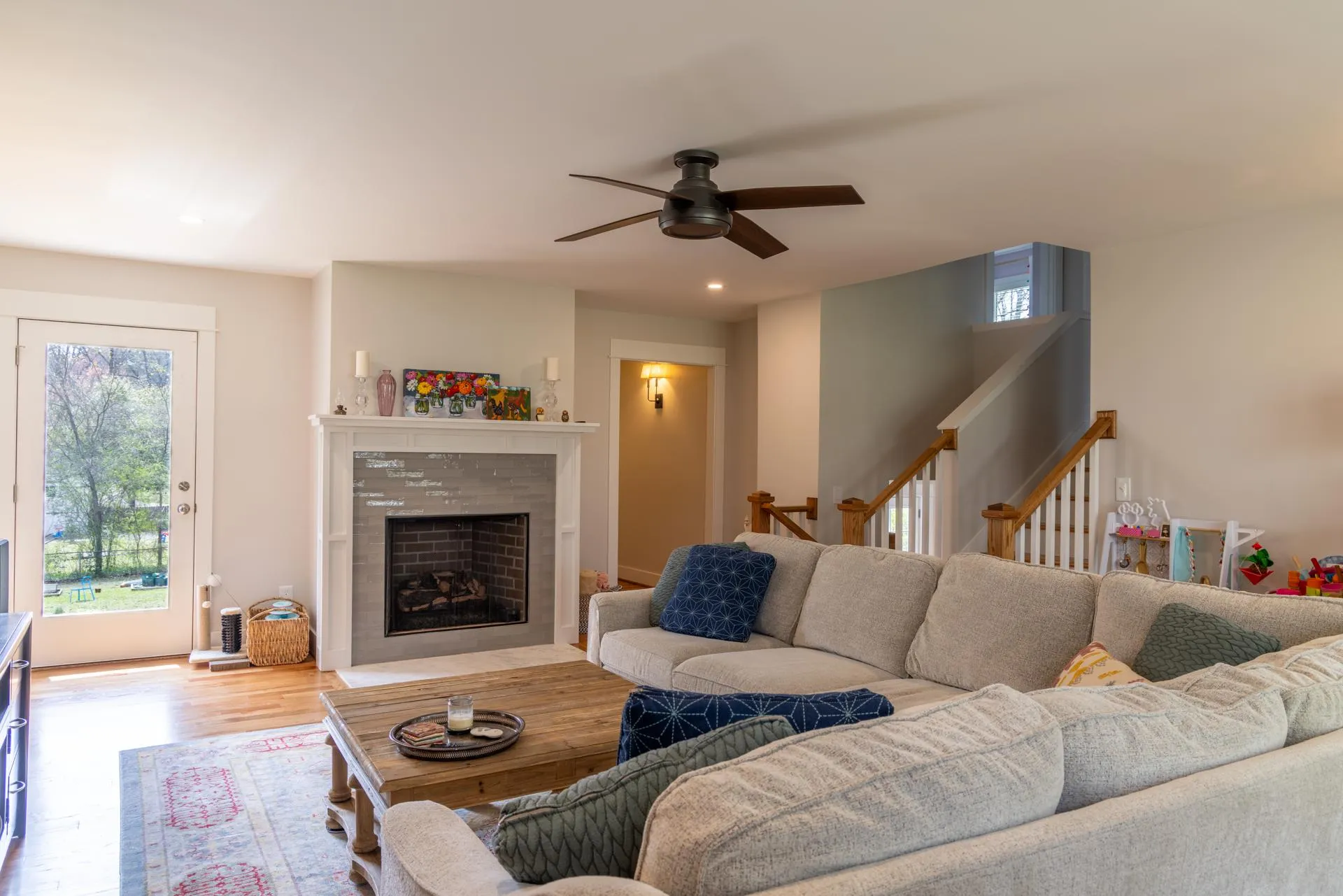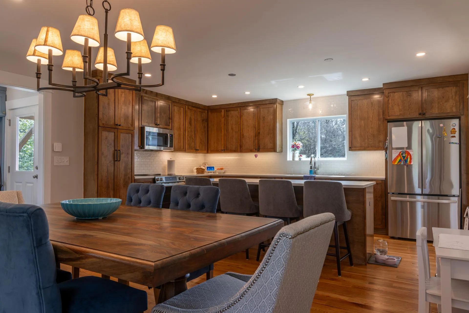 Open and Inviting Living Spaces We carried the warm hardwood floors throughout the main living areas to create a seamless, open-concept flow. In the dining area, the fireplace was updated with a stylish new tile surround, creating a beautiful focal point. The adjacent living room is designed for comfort and relaxation, seamlessly connecting the entryway, dining space, and kitchen into one harmonious area.
