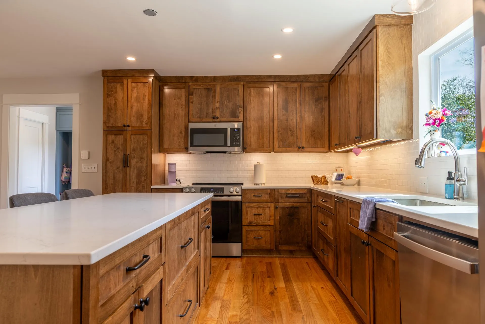 The Heart of the Home: A Chef's Kitchen The kitchen was completely reimagined to be the true heart of the home. Custom-stained wood cabinetry provides ample storage and a rich, warm foundation for the design. This is perfectly complemented by brilliant white quartz countertops and a classic beveled subway tile backsplash. The large central island offers additional prep space, storage, and casual seating, making it perfect for both everyday meals and entertaining.