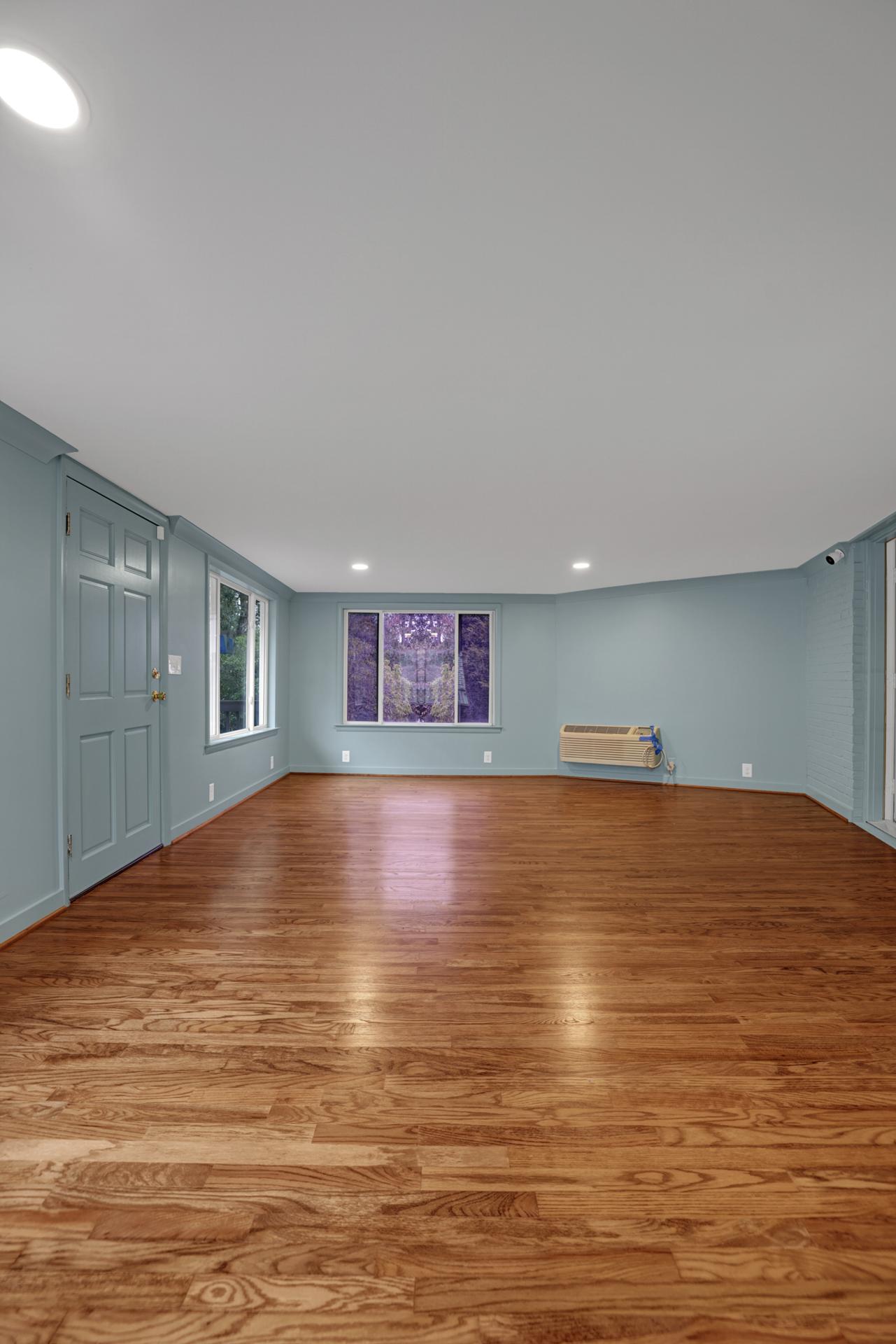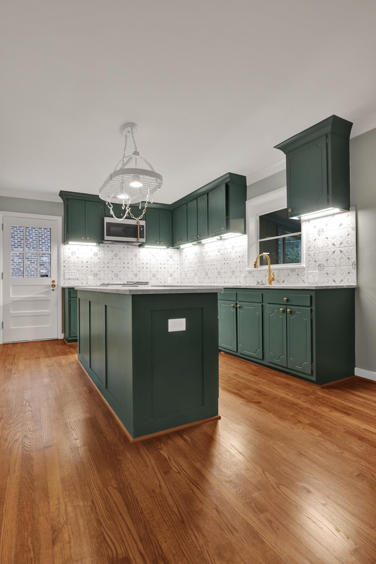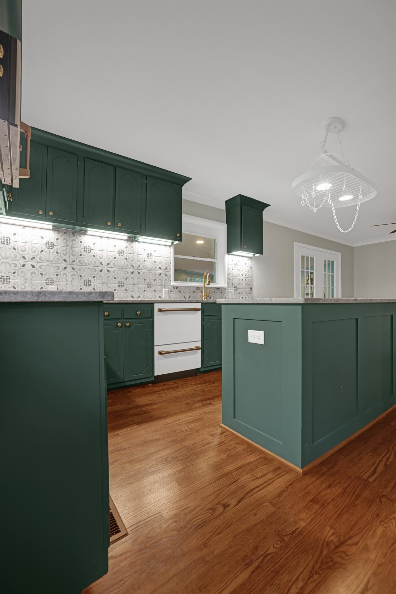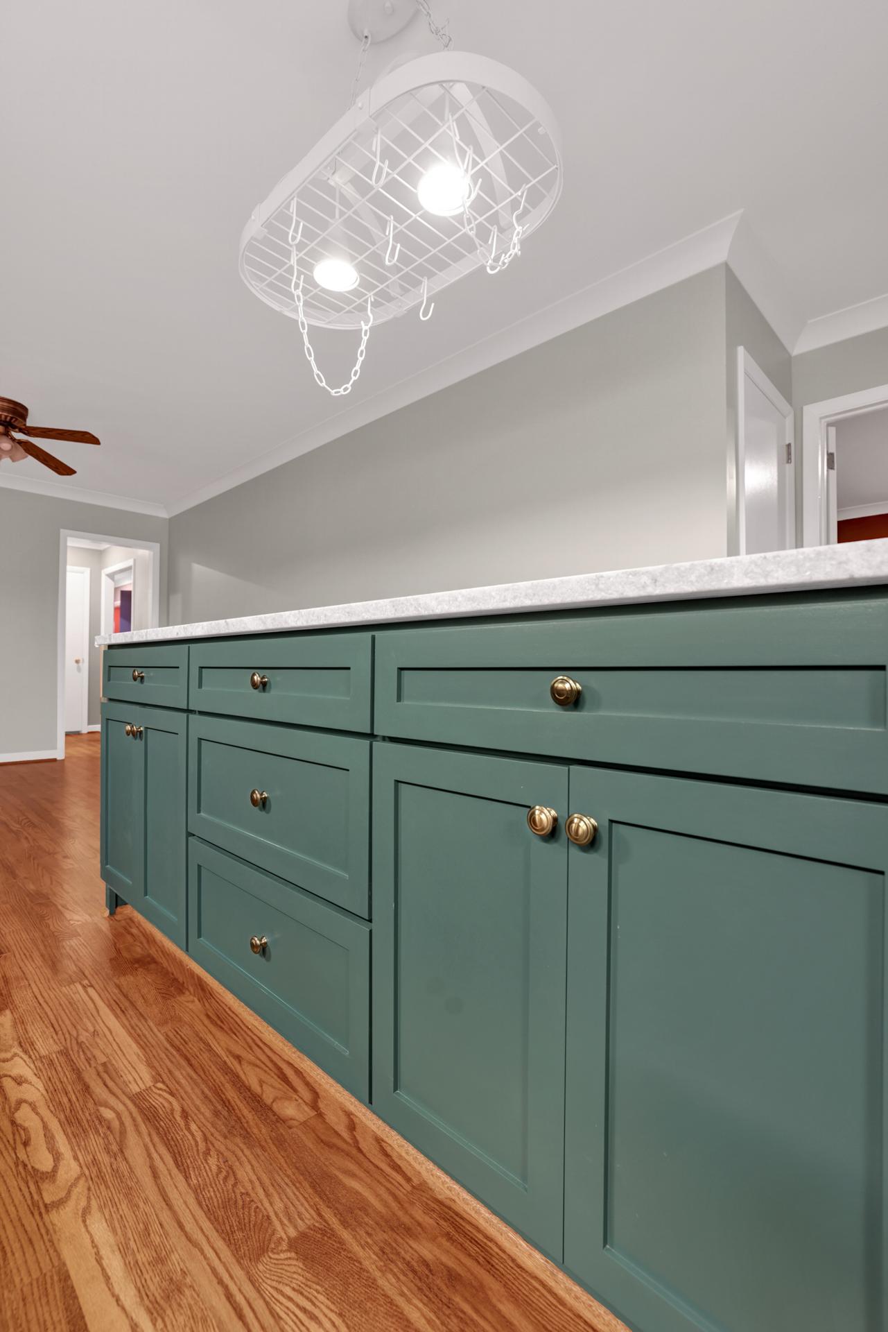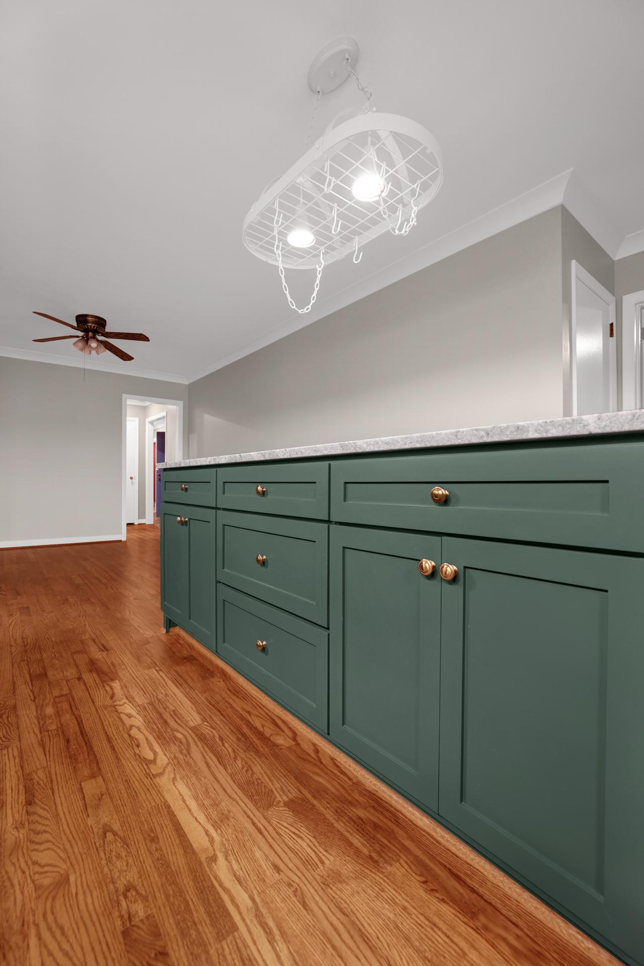 The kitchen received a new island and refinished cabinets, while both bathrooms were remodeled — expanding the master shower into a previous closet. We replaced old flooring with new hardwood, refinished existing planks, and repainted the entire interior for a cohesive look.