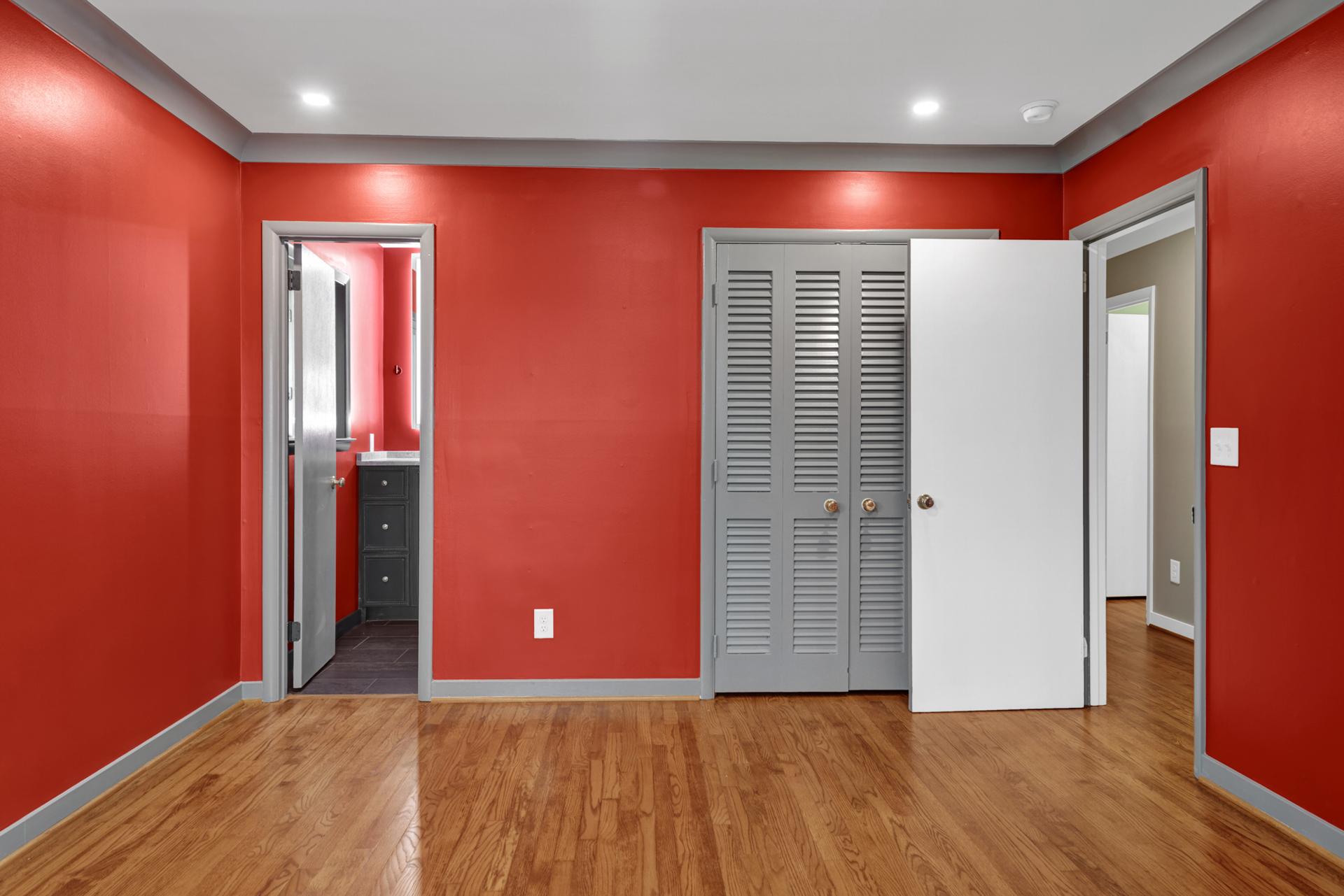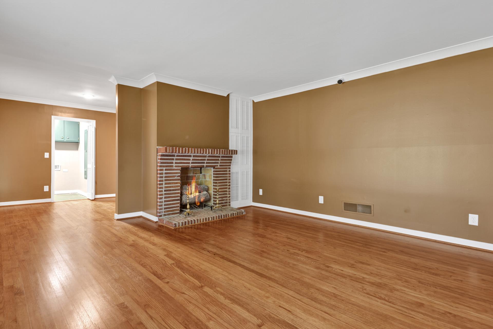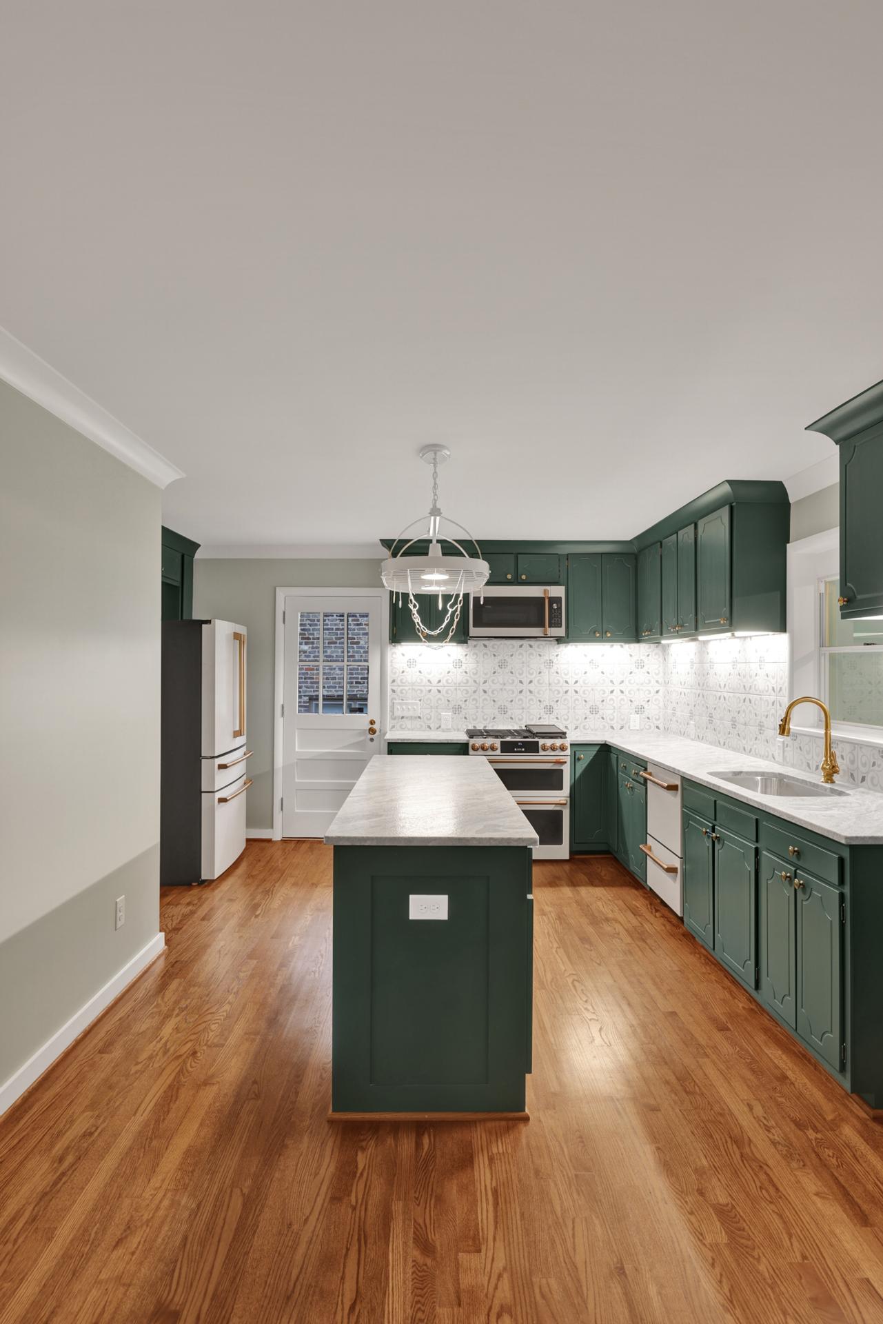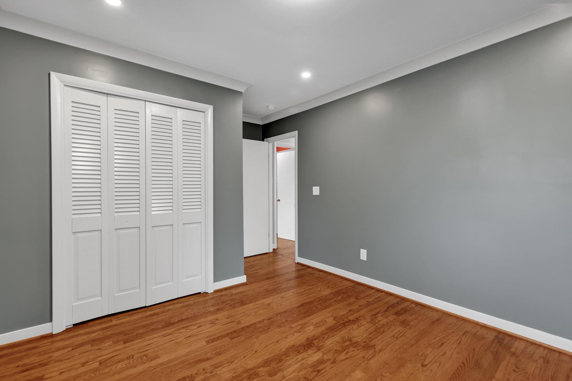 The kitchen received a new island and refinished cabinets, while both bathrooms were remodeled — expanding the master shower into a previous closet. We replaced old flooring with new hardwood, refinished existing planks, and repainted the entire interior for a cohesive look.