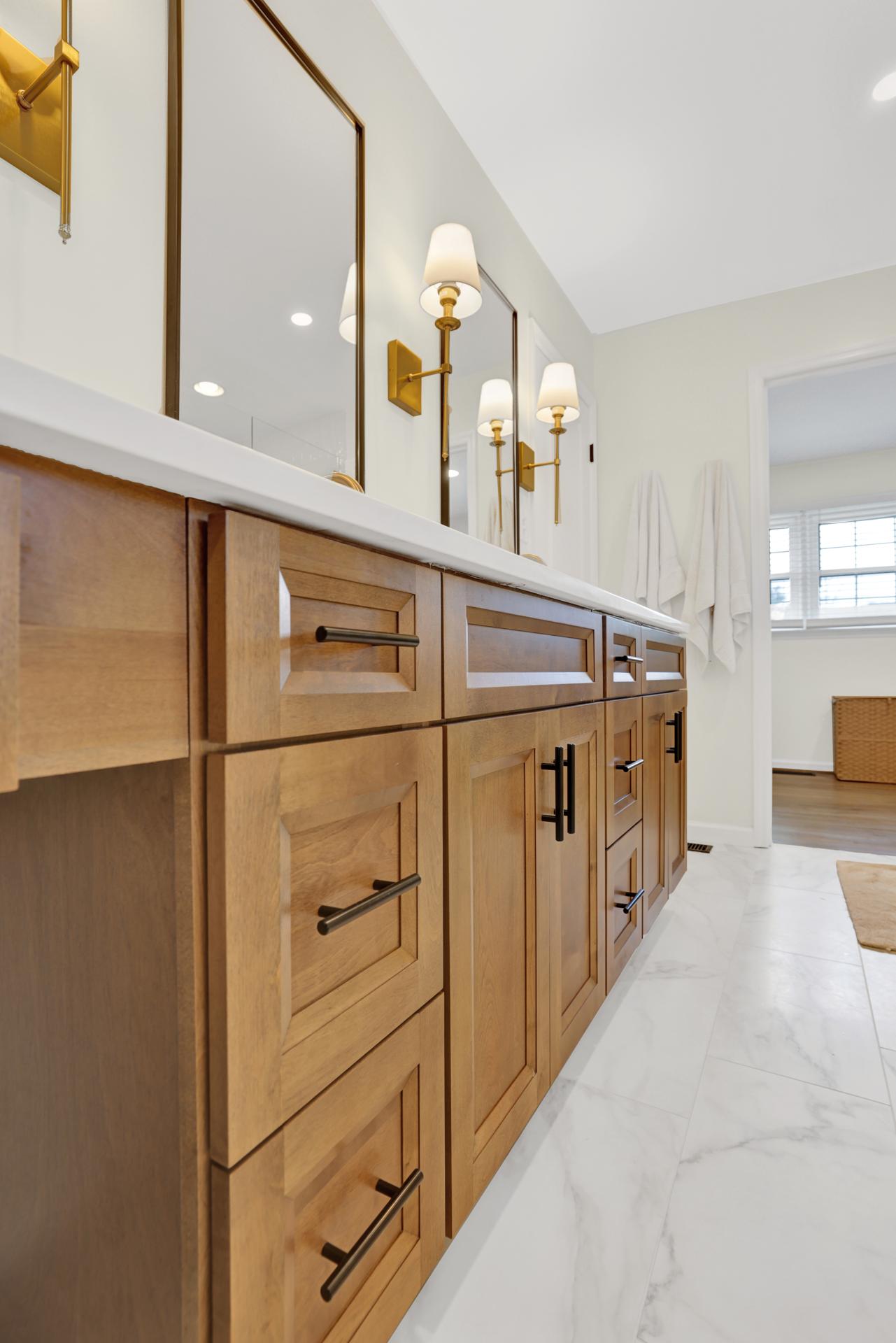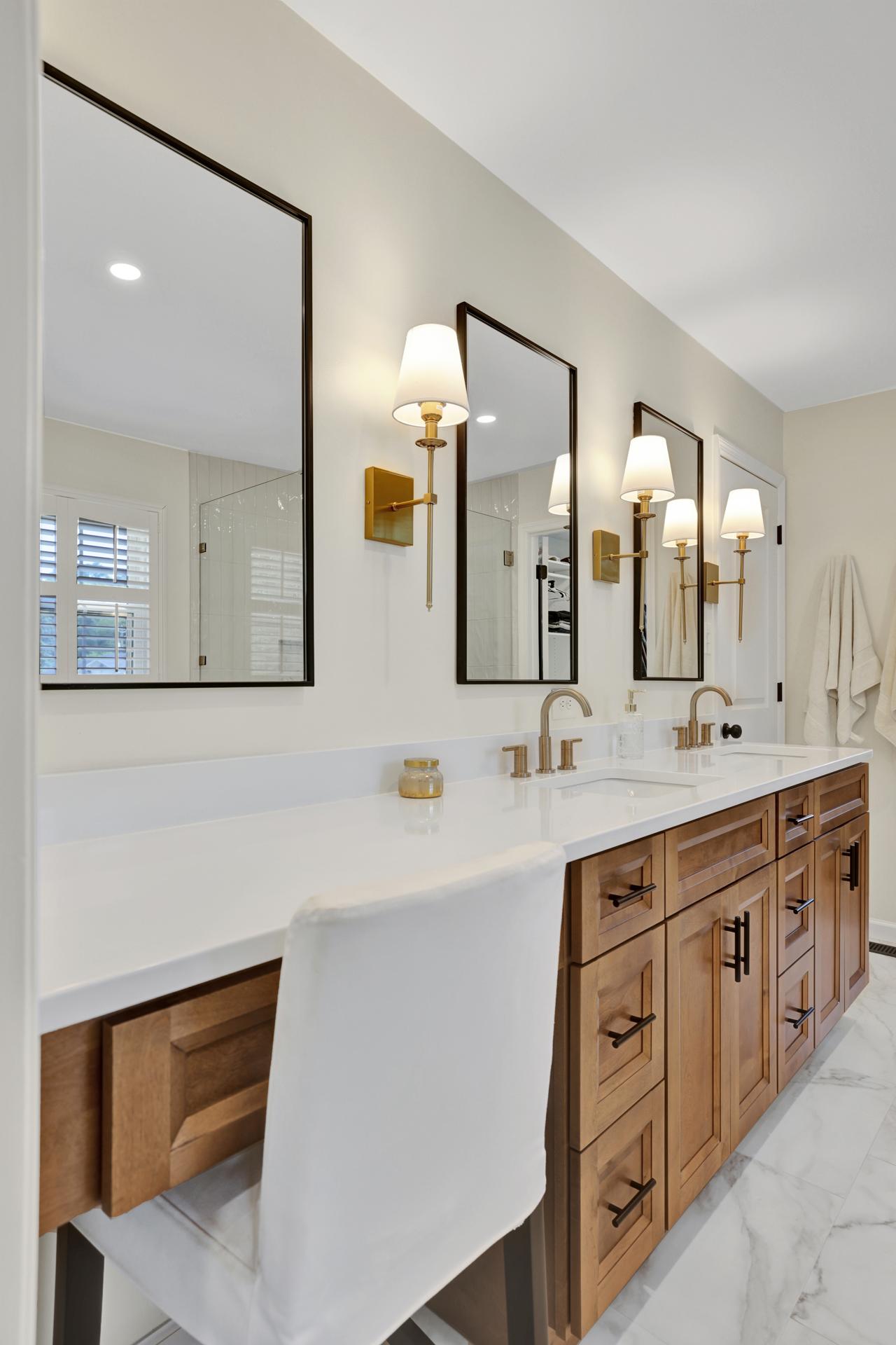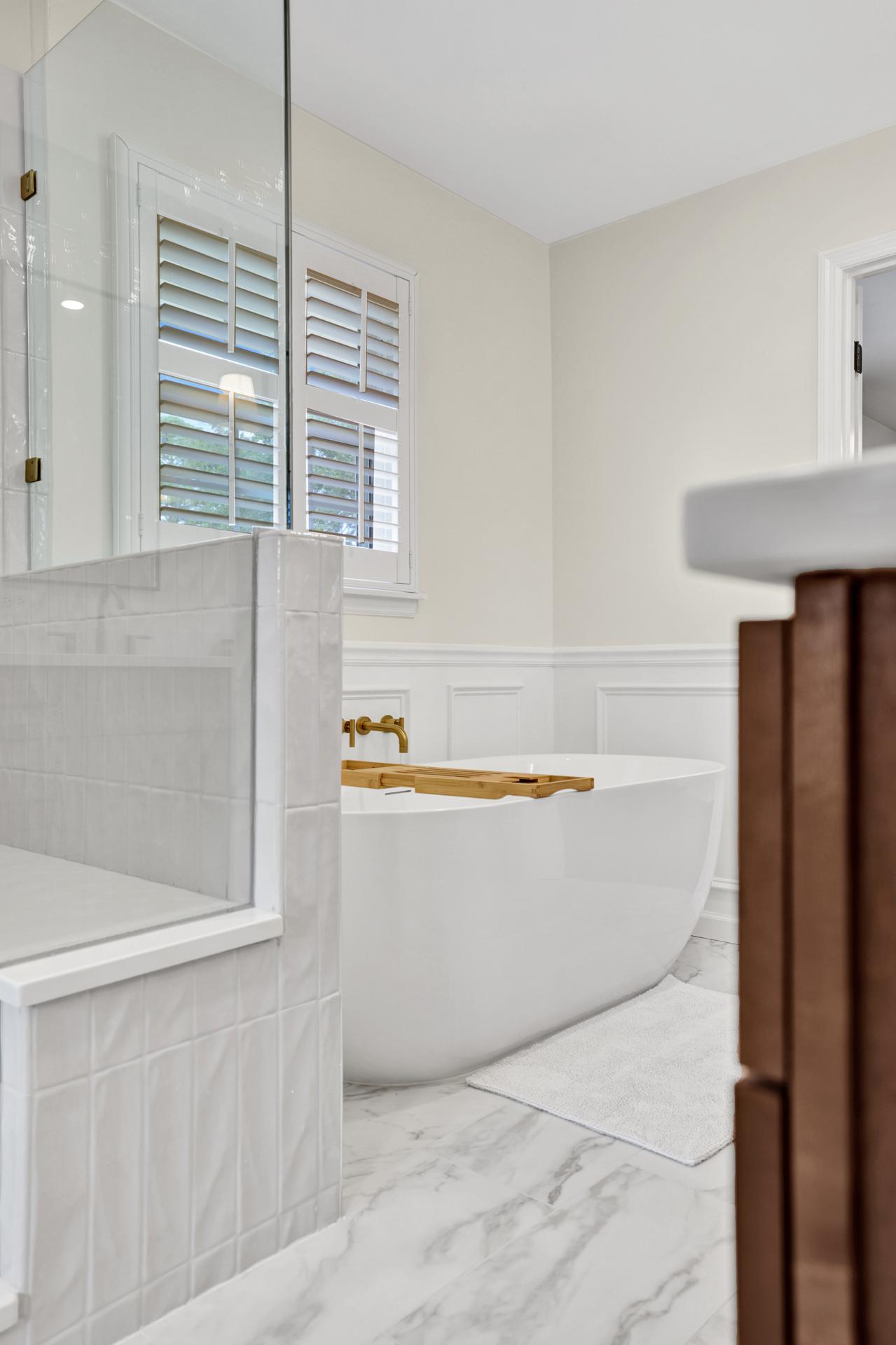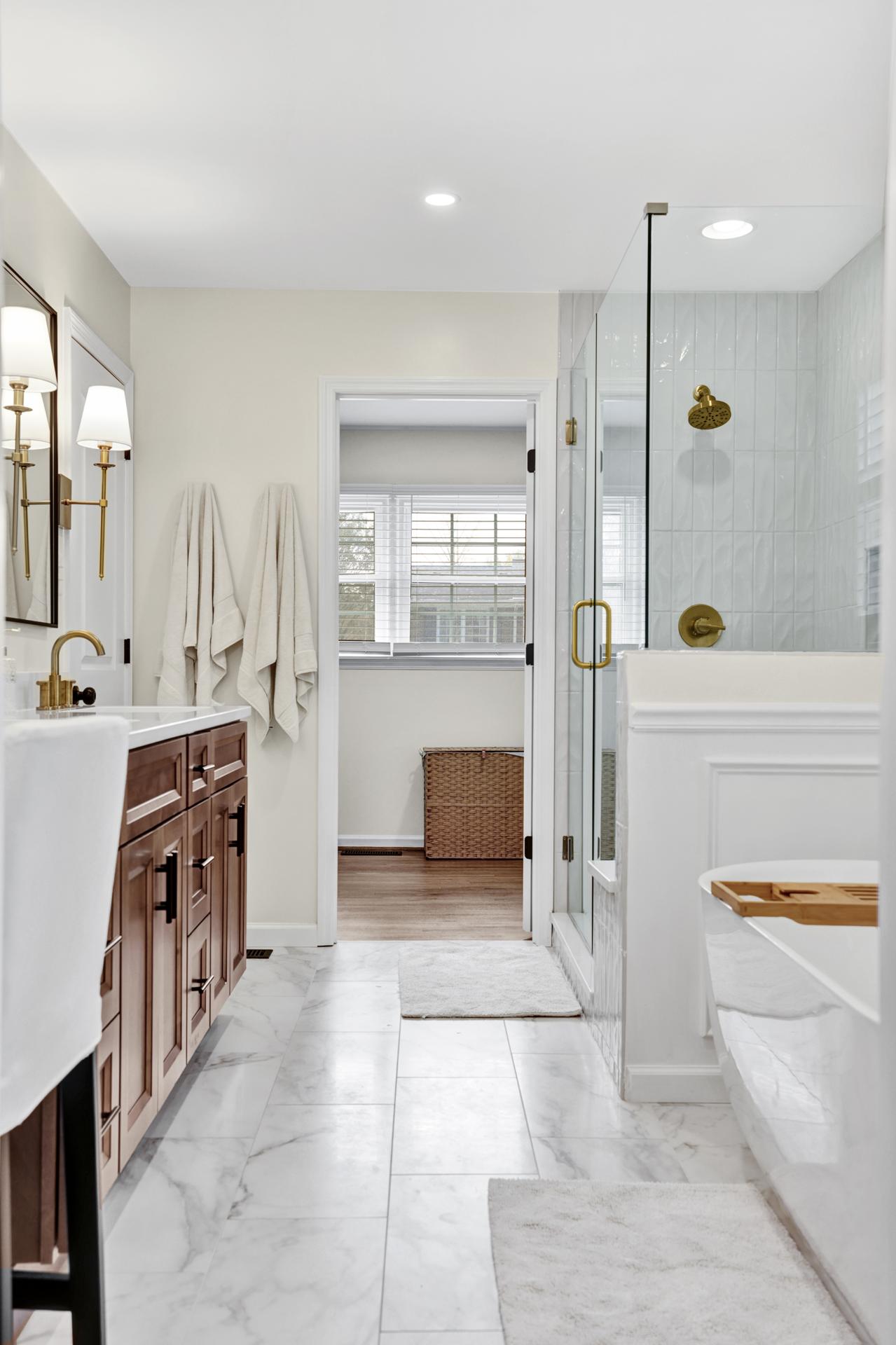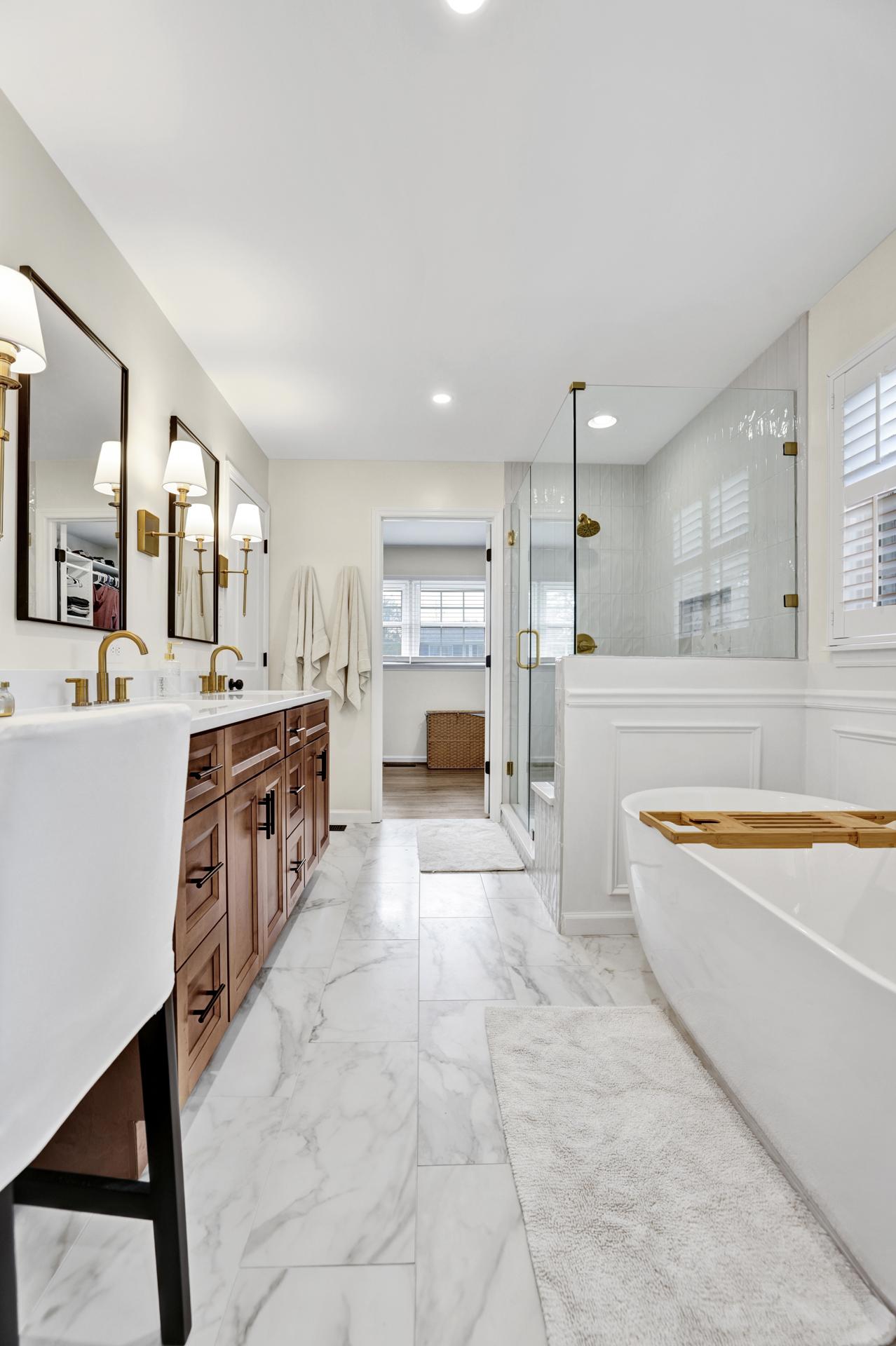 Our team reimagined the layout by opening the wall between the kitchen and dining room, creating an airy, connected main living area. We also converted a front bedroom into a stunning master bathroom and custom closet, giving the homeowners a private retreat within their home.
